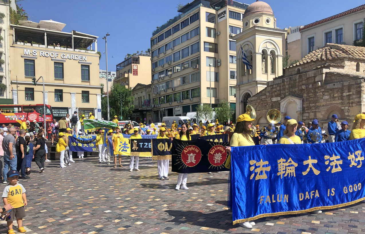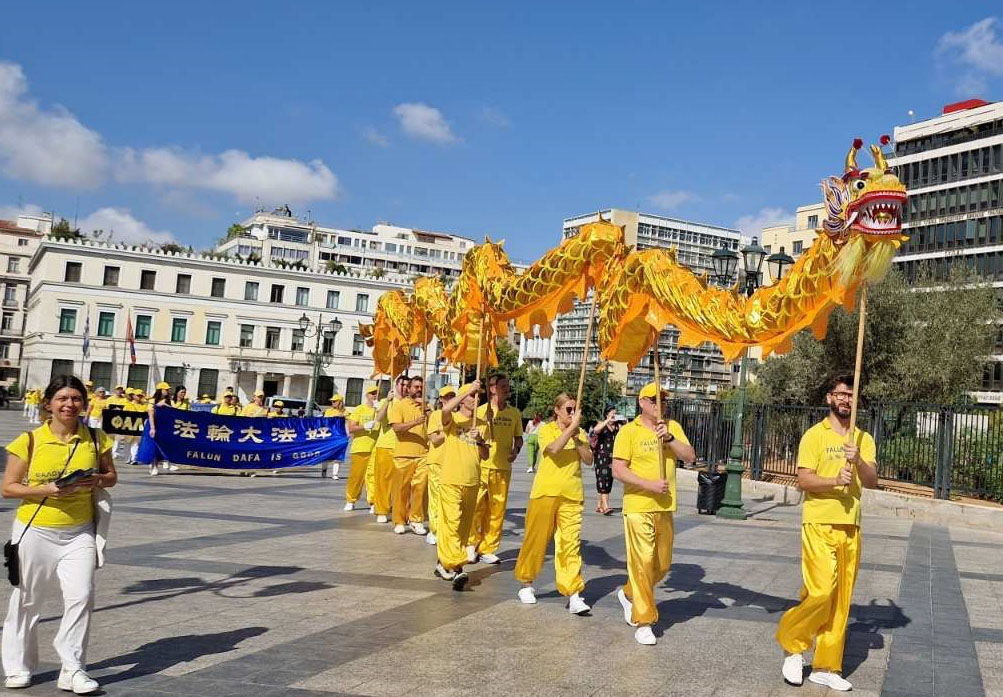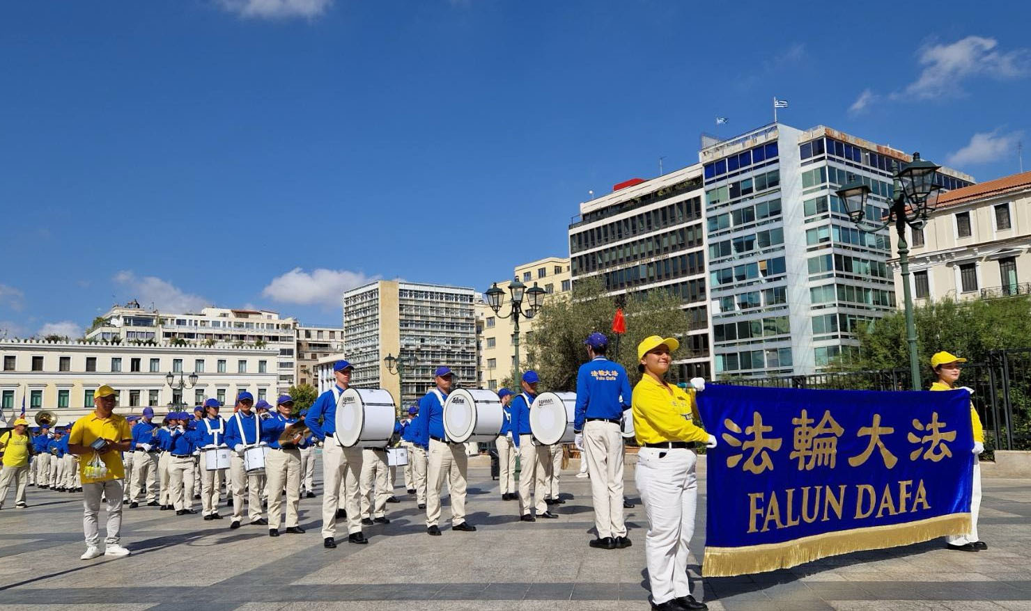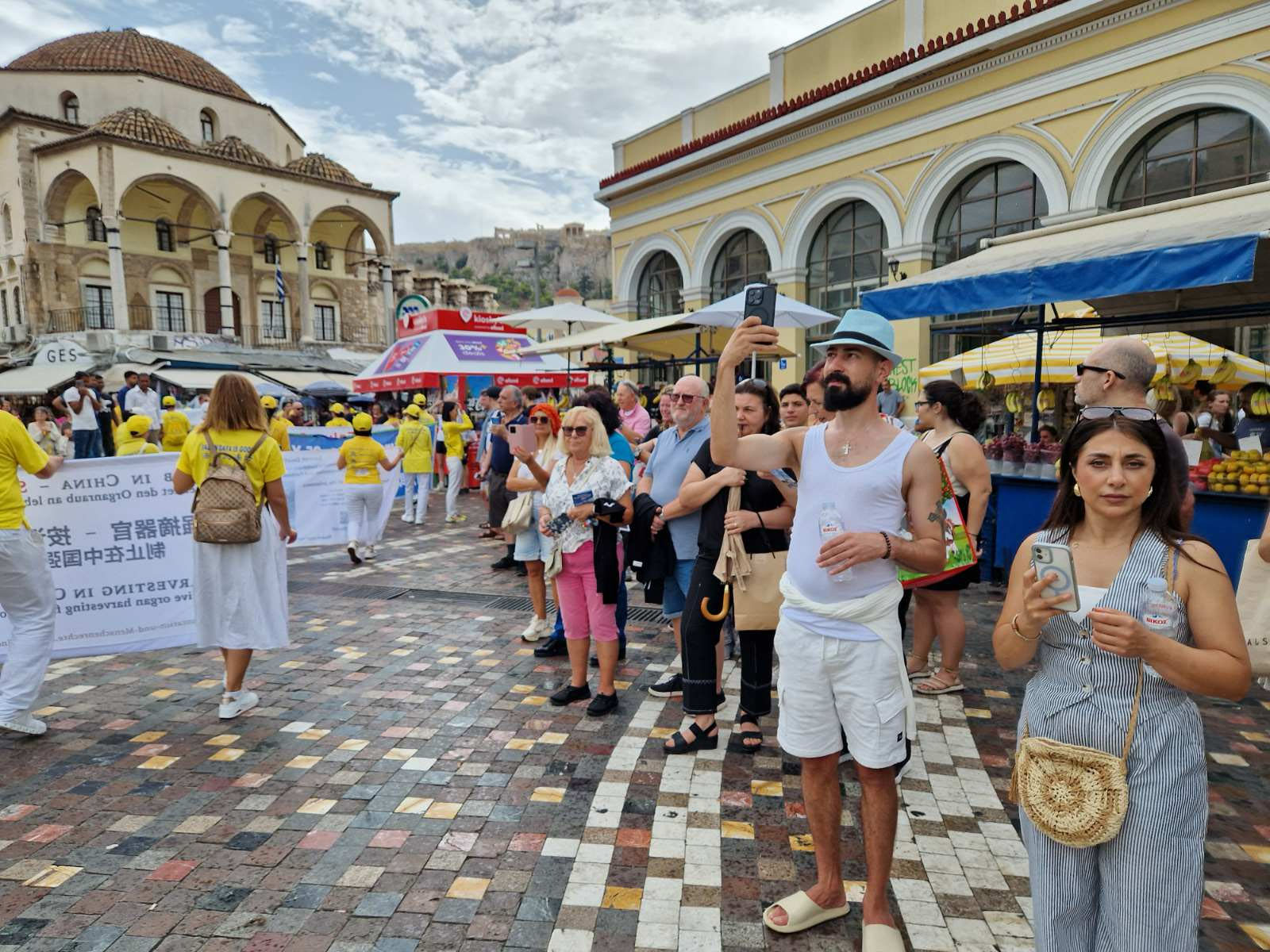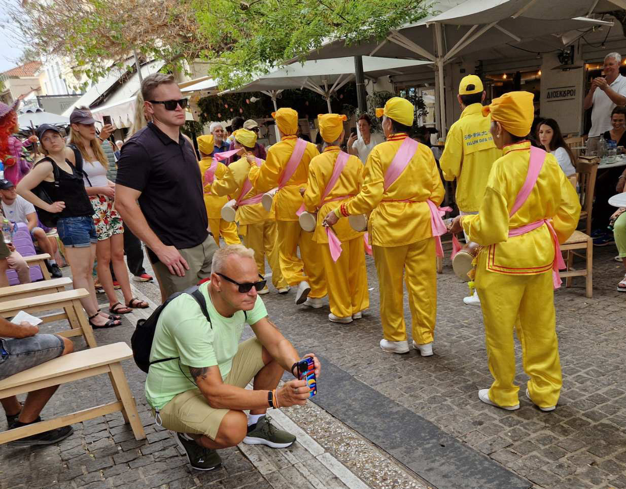 游行路线经过了雅典的众多繁华地区,如政府中心、购物街和博物馆。乐团和鼓手的演奏吸引了路人的关注,他们纷纷拍照并接受学员们递来的法轮大法介绍单张。办公人员也走出大楼,向学员们了解法轮大法的资讯。