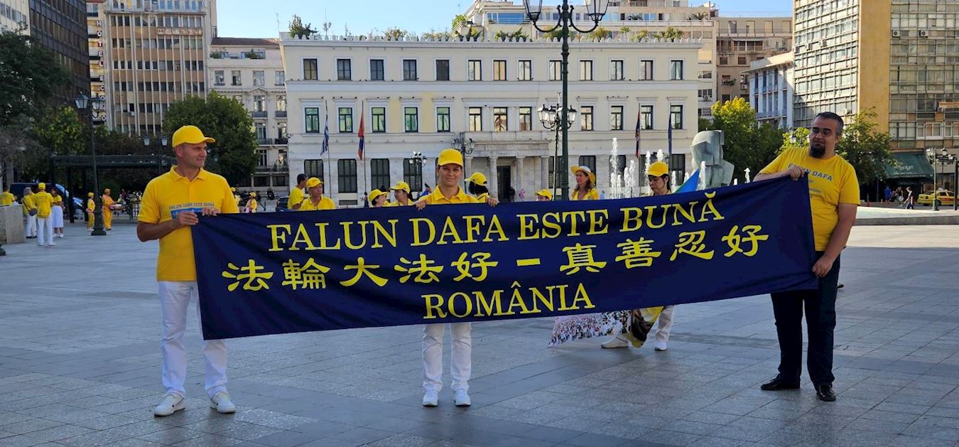 在雅典期间,许多罗马尼亚人看到横幅上的母语文字后主动与学员交谈,在了解了法轮大法的真相后,对自己民族的人参加了这场和平抗议而感到自豪。