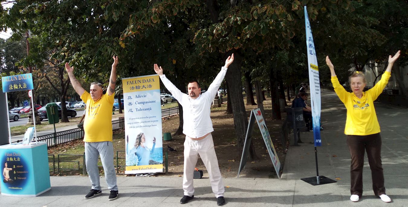 在她拿着传单离开之前,她询问是否有室内炼功地点,学员告诉她在布加勒斯特最大的公园有户外炼功点,她也可以用法轮大法创始人李洪志大师的教功录像在家炼功,她可以在法轮大法官方网站上找到这些录像,官网上还有李洪志先生的著作,所有资料均可免费获取。