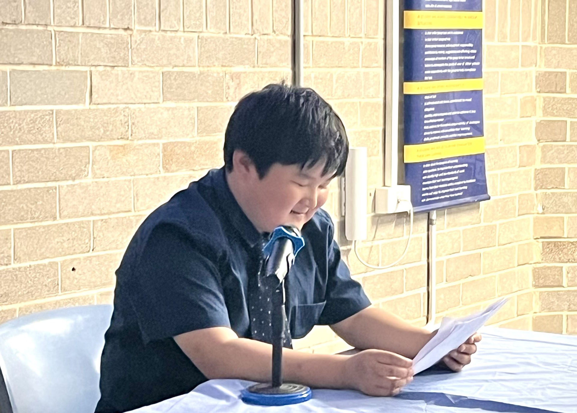 小班最小的一位小朋友小杰,因为还不太会念稿,就请一位大班的哥哥帮忙,他们一起在台上给大家分享了他小时候经历的两次很神奇的化险为夷的故事。其中一次是他的头被摔破流血不止,吓得大哭,妈妈叫他不停地念“法轮大法好,真善忍好”,结果五分钟后,“我头不痛了,也不哭了,血也不流出来了。妈妈帮我清理干净,带我到师父法像前合十,谢谢师父救了我。现在我头上还留下一个小疤痕呢。”