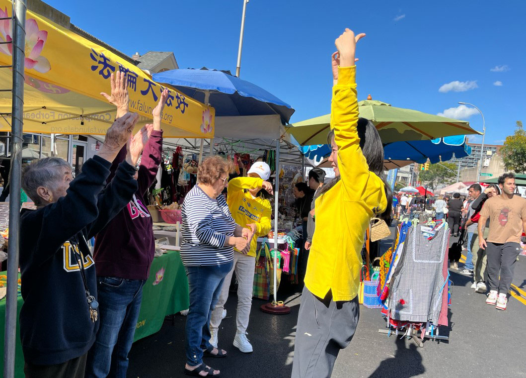 【明慧网二零二四年十月九日】二零二四年十月五日,秋高气爽,法轮功学员在纽约雷哥公园举办了街市弘法活动,受到社区民众好评。他们纷纷来到法轮功展位听闻了真相,签名支持结束中共和支持法轮功保护法案;不少有缘人被法轮功的纯正能量吸引,自然汇聚到法轮功展位购买法轮功书籍、报名参加九天班和现场学功;还有的人希望每次的街市活动都能看到法轮功的展位。