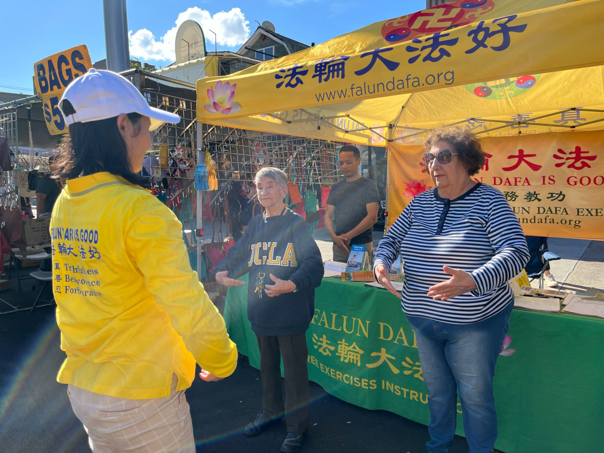 图8:从小就来到美国的苏珊(Susan X)女士(右)在与法轮功学员交流。