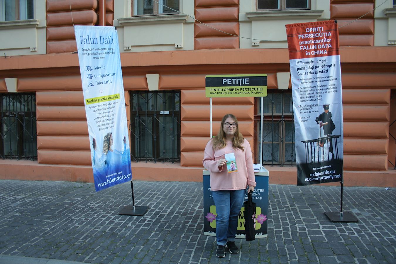 来自布拉索夫丹尼莎·埃内亚是一位社会和传播学专业的学生,二零二四年十月十九日,她特意来到法轮功展位在反迫害请愿书上签名,她说:“我非常喜欢中国的(传统)文化,当我听说他们(中国人)仍然生活在极权政权下时,我感到很难过。我不知道法轮功,但我很想了解一下。”