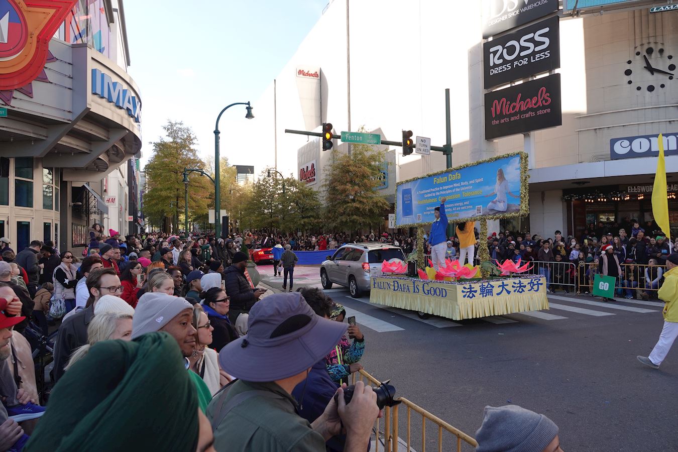法轮功学员游行队伍包括花车和腰鼓队,两位青年法轮功学员在花车上演示功法。腰鼓队带给民众平和与喜庆,人们伴随着音乐和鼓点为他们鼓掌喝彩。写有英文的“法轮大法”、“世界需要真善忍”的横幅所传递的信息受到沿途民众的欢迎。
