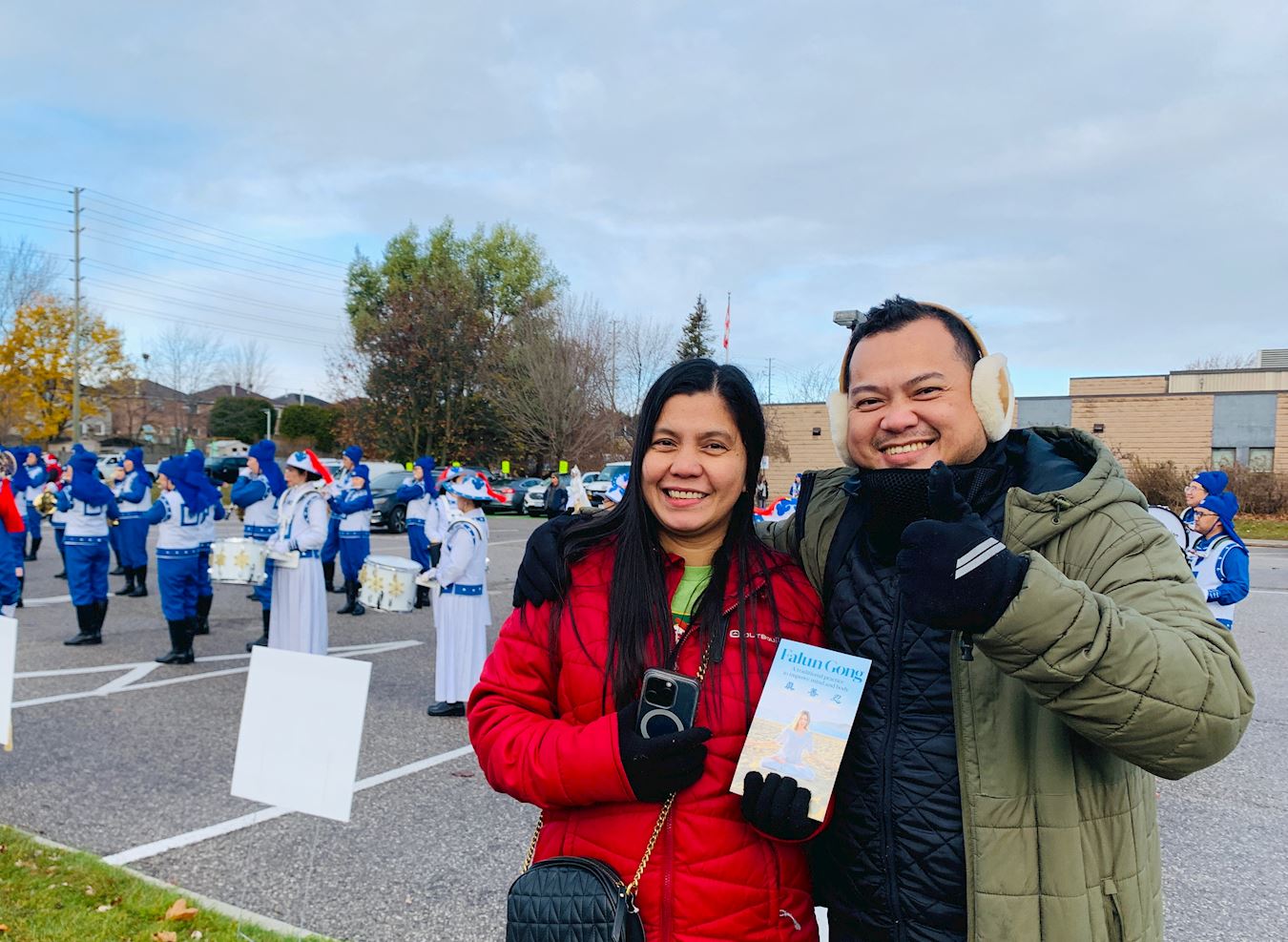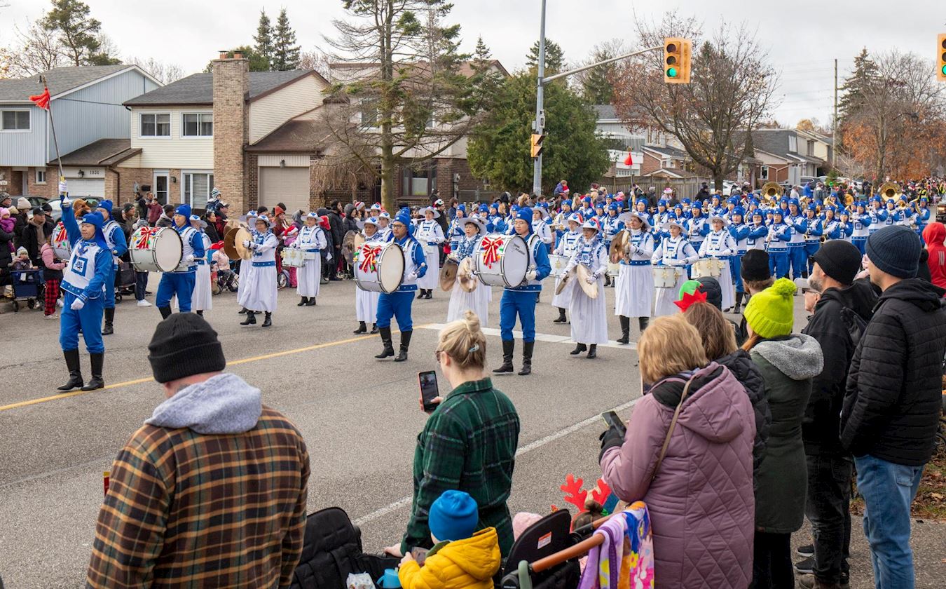 二零二四年十一月二十三日,由多伦多法轮功学员组成的天国乐团,于早上十点参加了在皮克林镇(Pickering)举行的圣诞节游行。当天下午四点半,他们又驱车前往亚积士镇(Ajex),与同样是法轮功学员组成的腰鼓队会合,共同参加了在当地举行的圣诞庆祝活动。