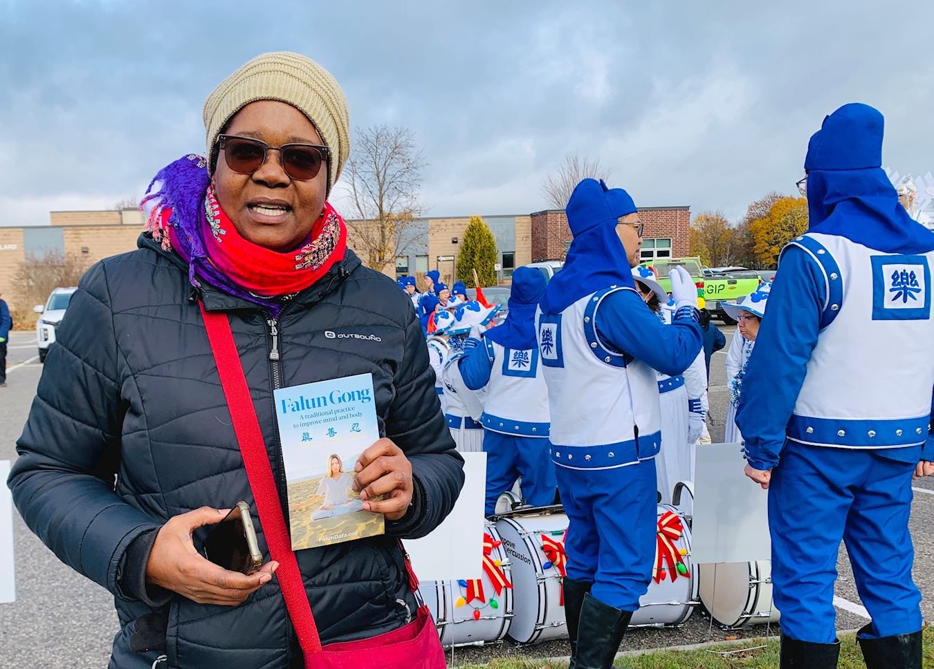 学员拿出法轮大法的传单,向她介绍这个乐团是由法轮功学员组建的。当她看到传单时,她表示自己知道法轮功,她之前有一位家住万锦市(Markham)的朋友就是法轮功学员。那位朋友向她介绍过,还送给她一个带有“法轮大法好”字样的小莲花,并介绍是作为一种平和的象征。同时,桑迪表示她认为真、善、忍的理念也是很对的。