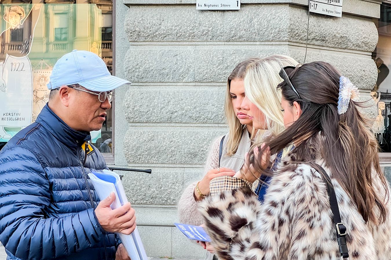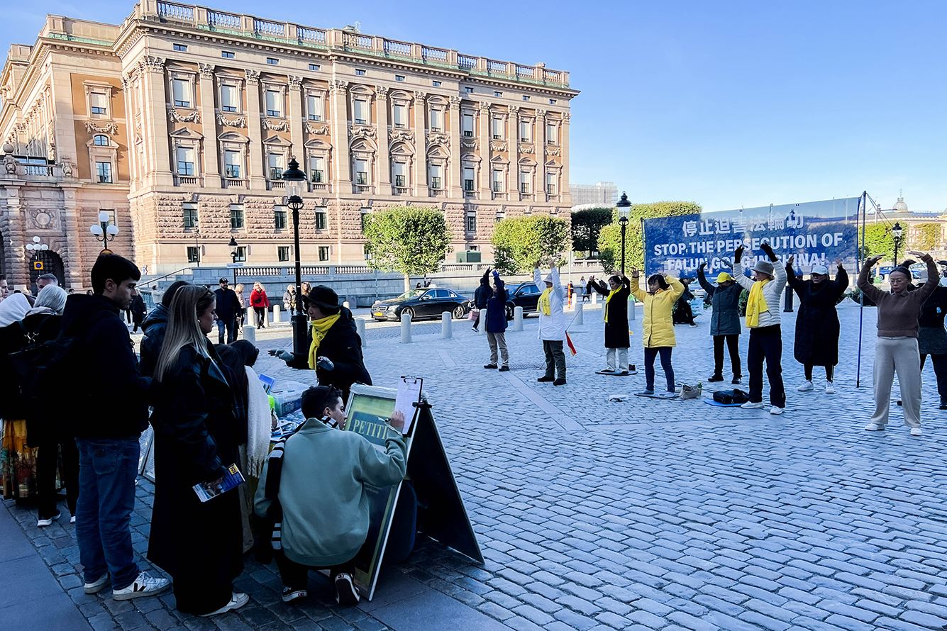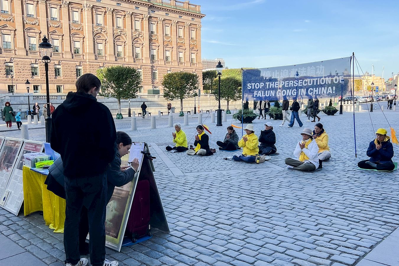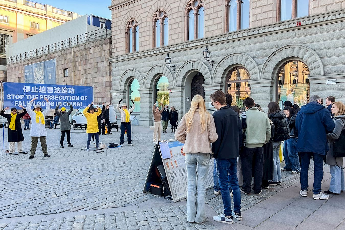 金秋十月是一年一度诺贝尔奖揭晓的季节。斯德哥尔摩是诺贝尔的故乡,也是旅游、户外爱好者的乐园。在熙熙攘攘的钱币广场,人们看到法轮功学员宁静祥和的炼功场面,了解了中共对信仰真、善、忍的群体实施的残酷迫害、以及活摘人体器官真相时,震惊又愤怒,纷纷签名支持反迫害。有不少对功法感兴趣的人,当场就学炼功动作。