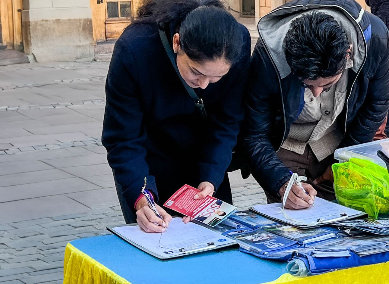 来自英国的一对夫妇经过活动现场时,太太主动停下来与学员交谈,先生在展板前仔细阅读了解详情。太太得知中共活摘法轮功学员器官很是气愤,她谈到自己是从中共对香港人的残酷镇压,看清了中共的邪恶。“今天我更清楚了中共是一个如此邪恶的政权。我签字就是为了支持你们!”随后,她还招呼自己的先生,问他是否也愿意过来签个名。