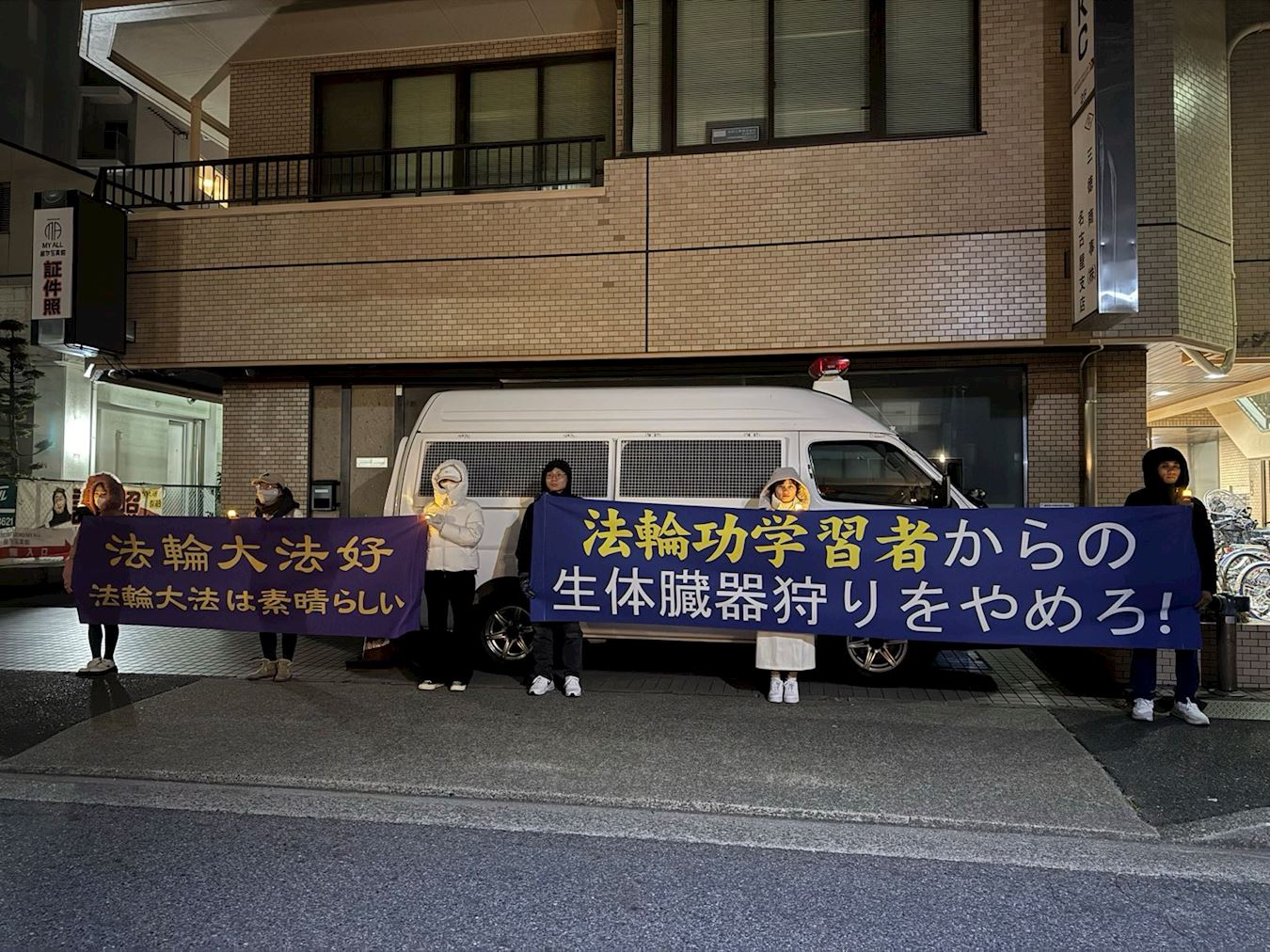 当时,室外温度只有三度,法轮功学员冒着严寒打出了“法轮大法好”的中日文横幅,以及“停止活摘法轮功学员器官”的日文横幅,手持蜡烛呼吁中共停止在中国大陆对法轮功学员的残酷迫害,同时为在中共发动的这场对法轮功学员的残酷迫害中含冤离世的法轮功学员进行哀悼。