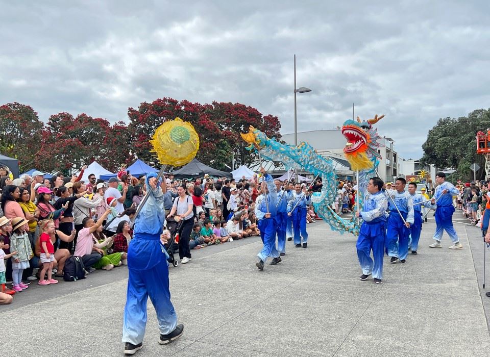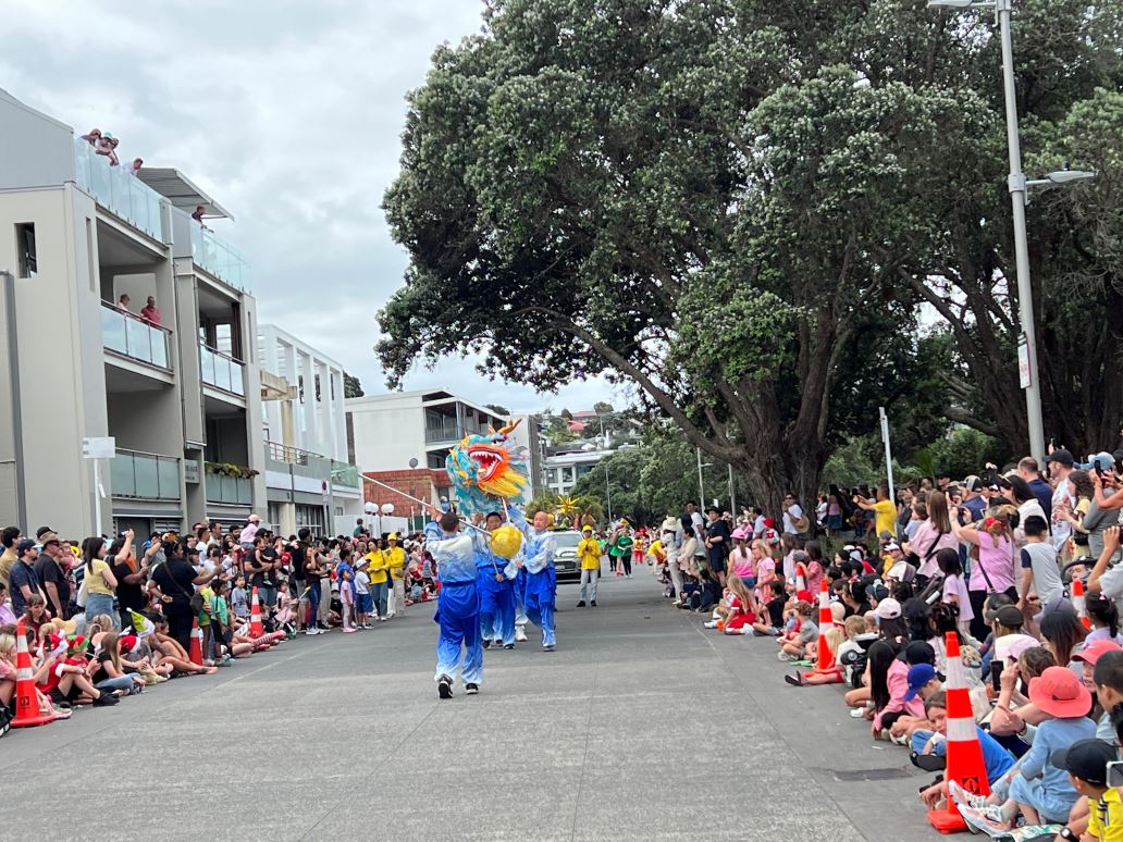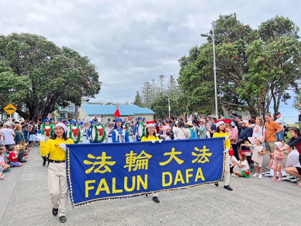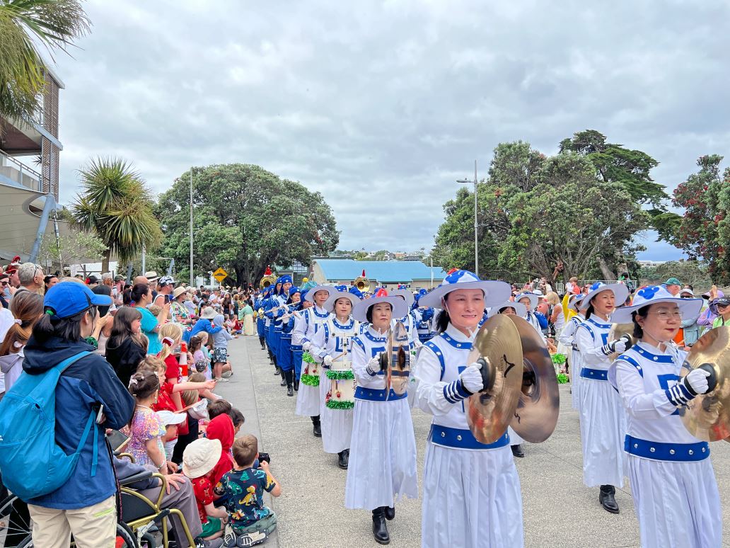 ![]() 图6~10:二零二四年十二月七日,由新西兰法轮功学员组成的天国乐团和舞龙队参加了奥克兰Browns Bay区圣诞游行。 |