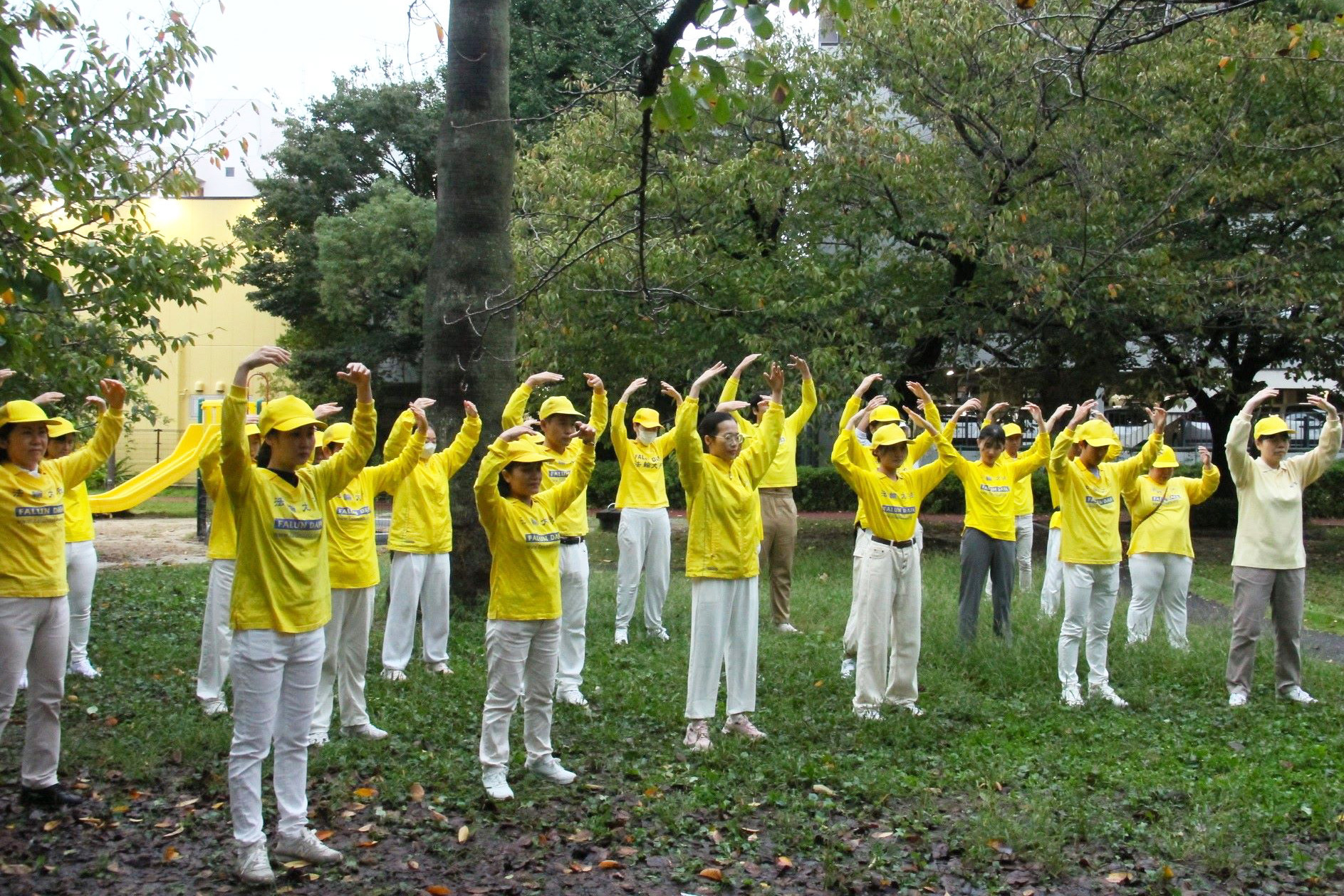 ![]() 图1:福冈炼功点法轮功学员一起炼功(第二套功法──法轮桩法) |
