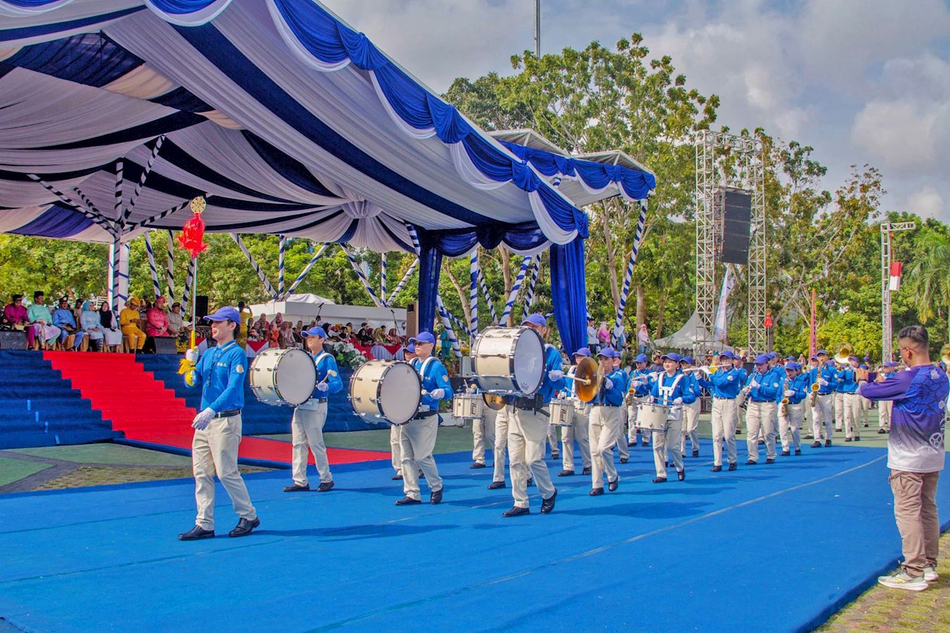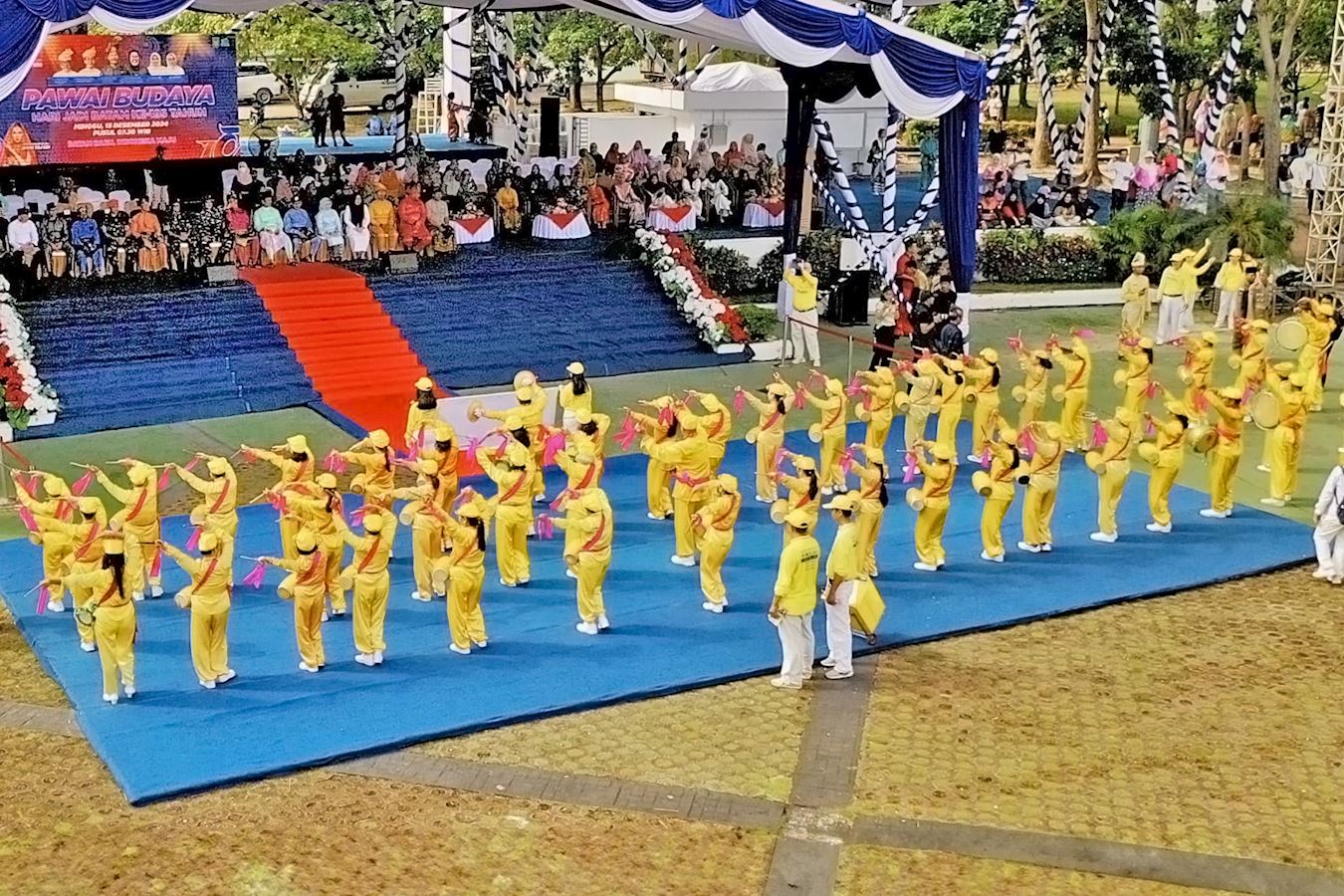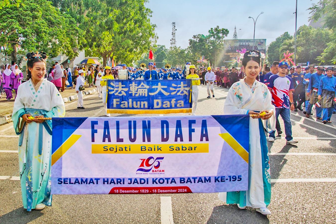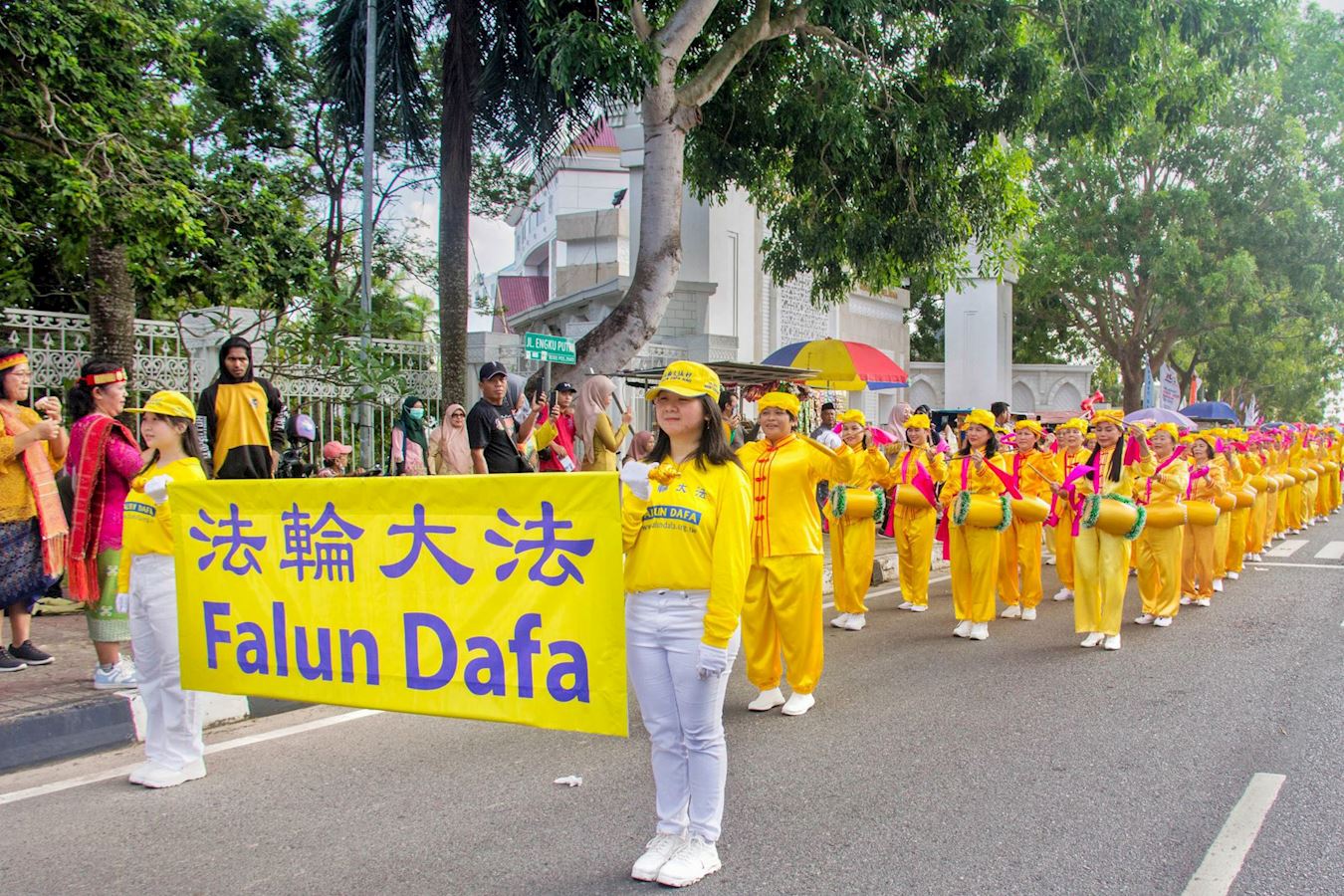 游行的起点在恩古·普特里广场(Engku Putri Square),参加的队伍身着民族服装,他们中有政府雇员、学生,以及来自当地社区和俱乐部等多个团体,法轮功学员的队伍由天国乐团打头阵,随后是仙女队、腰鼓队以及身穿黄色服装、手持气球的法轮功学员。