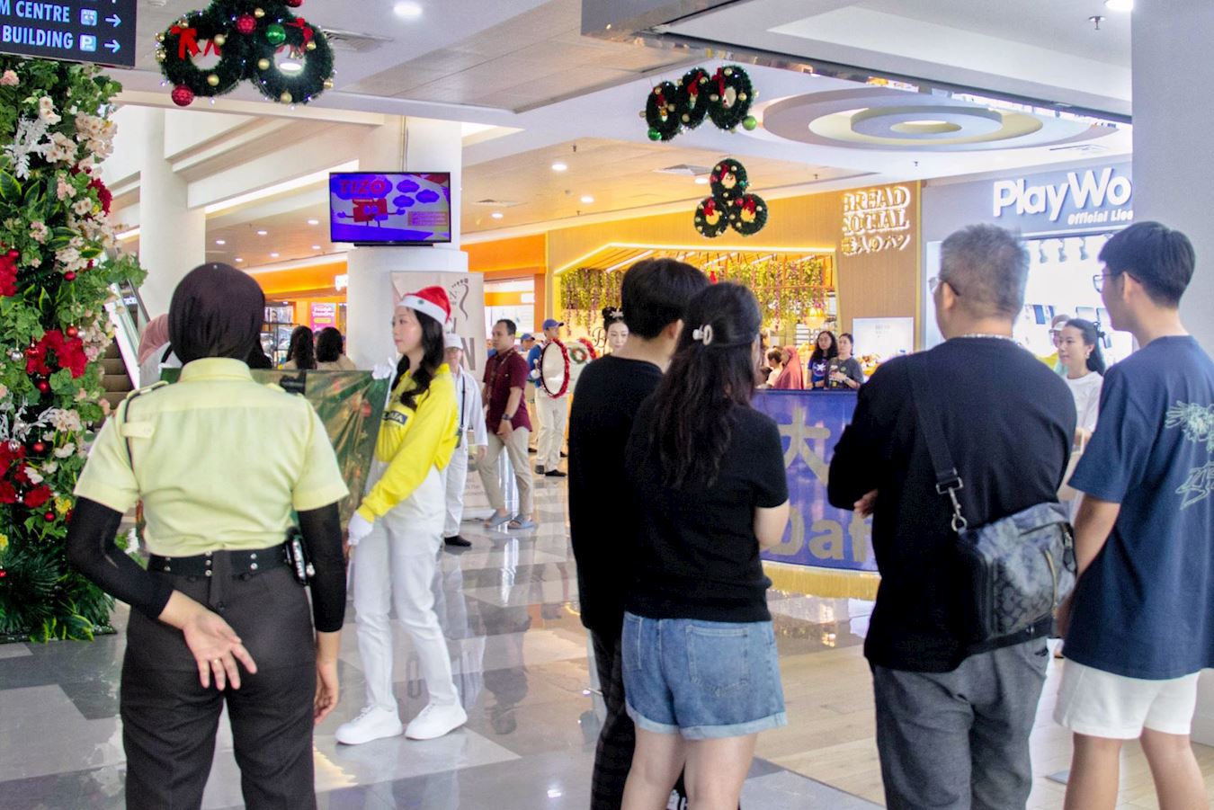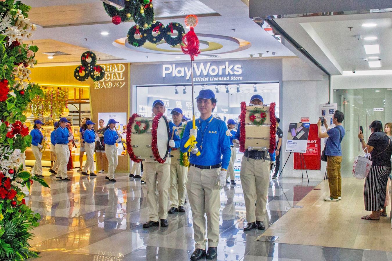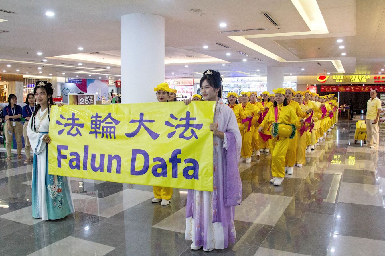 十二月十四日,即游行的前一天,法轮功学员还受邀参加了在巴淡岛最大的购物中心之一的超级购物中心(Mega Mall)举办的圣诞节和新年庆祝活动,天国乐团和腰鼓队穿过商场的三个楼层,吸引了许多游客驻足观看。学员向民众发放法轮大法真相资料。