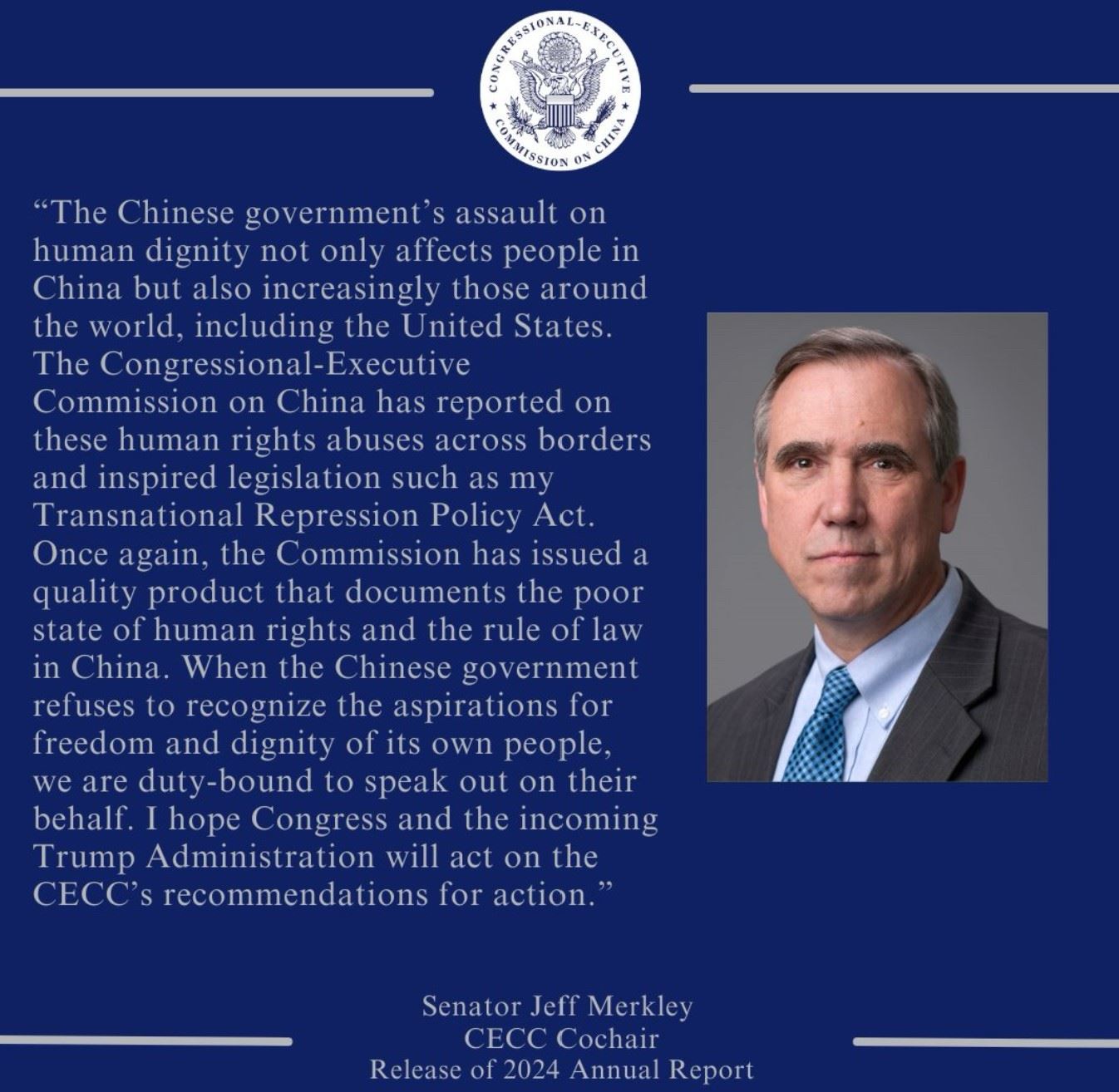 美国国会及行政当局中国委员会(CECC)主席克里斯·史密斯(Chris Smith)说:“在今天发布的二零二四年度报告中,美国国会中国委员会再次与中国人民站在一起,反对中国共产党。”