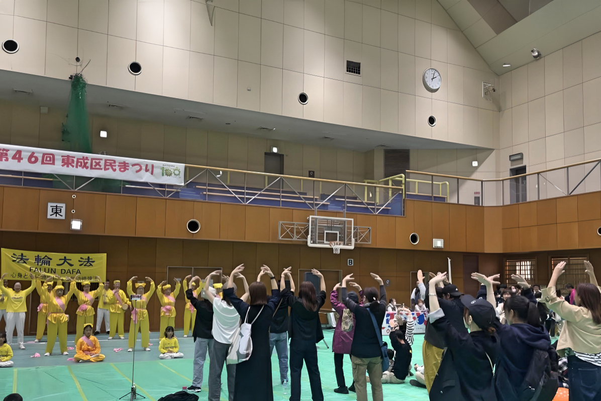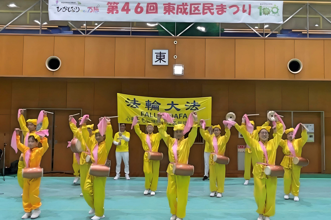 十一月十日在东成区举办的庆典活动,是分为室内和室外两个地点同时进行。有公开招募的团体带来的表演,还有地区的团体和企业提供的游戏和餐饮店出店,室外还同时进行地车囃子展示及搞笑艺人的现场表演,整个庆典活动让大人和孩子都热血沸腾。而在其中的一个会场东成体育中心内,首次参加的法轮功团体受到了民众的热烈欢迎。