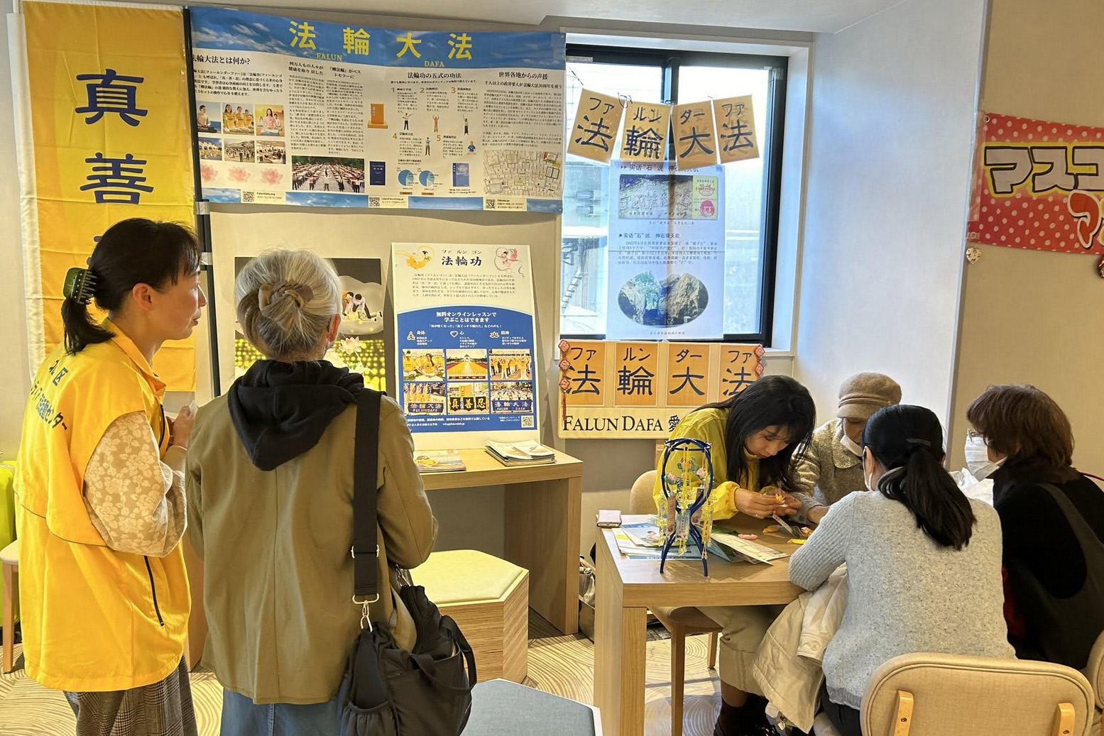 在大阪北区一年一度的义工庆典活动中,法轮功学员还设有展位。展位中挂有大法的真相资料和宣传板,法轮功学员在此介绍法轮功和讲述在中国法轮功学员所遭受的迫害真相。