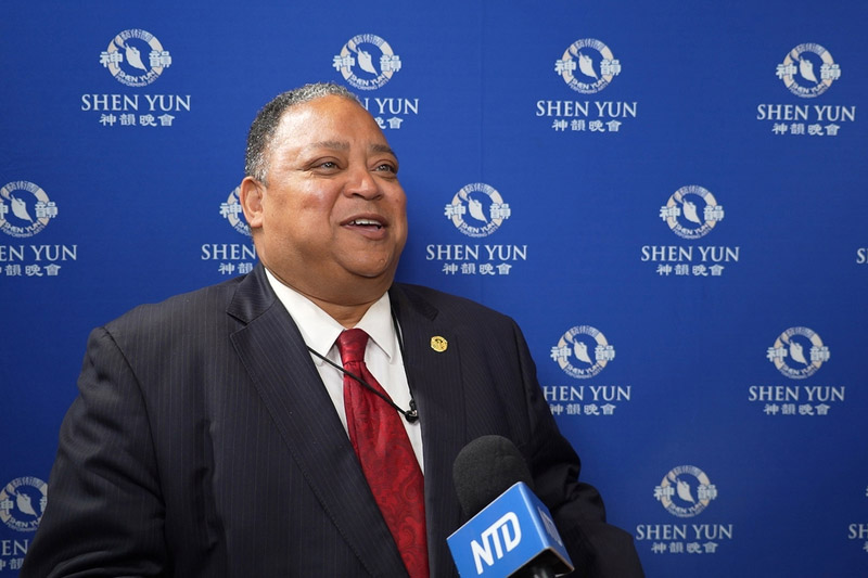 ![]() 图3:亚特兰大市议员迈克尔‧朱利安‧邦德(Michael Julian Bond)观看了神韵世界艺术团在亚特兰大的首场演出。(新唐人电视台) |
