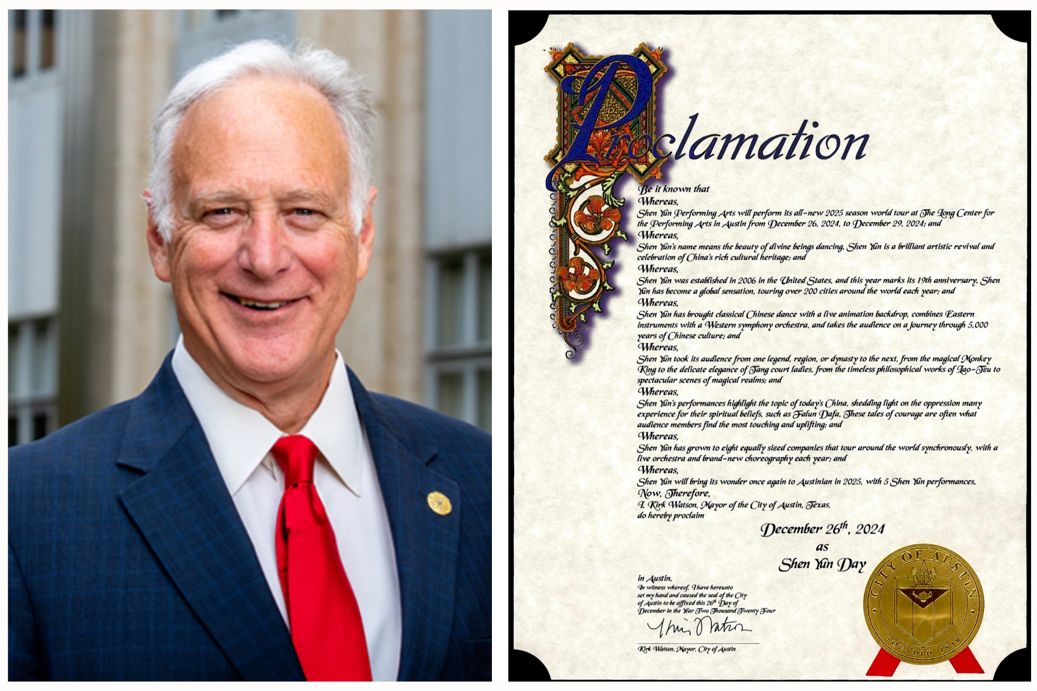 神韵开启二零二五演季之际,美国德州奥斯汀市长柯克・沃森(Kirk Watson)发来褒奖信,盛赞“神韵是对中国深厚文化遗产的一场辉煌艺术复兴与庆典”,并宣布“二零二四年十二月二十六日为神韵日(Shen Yun Day)”。