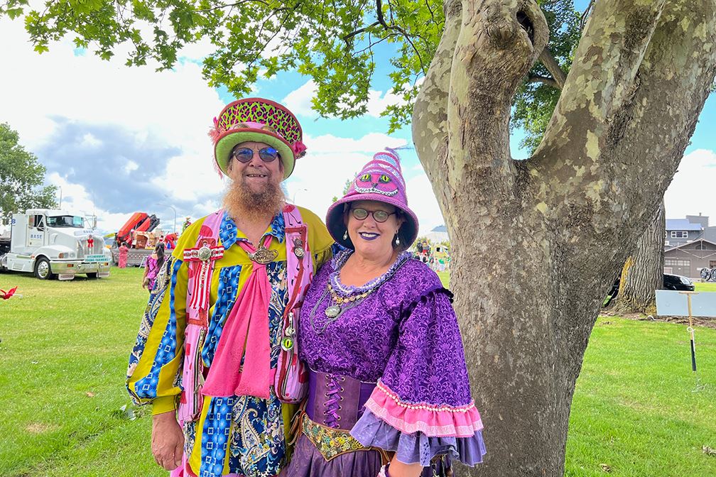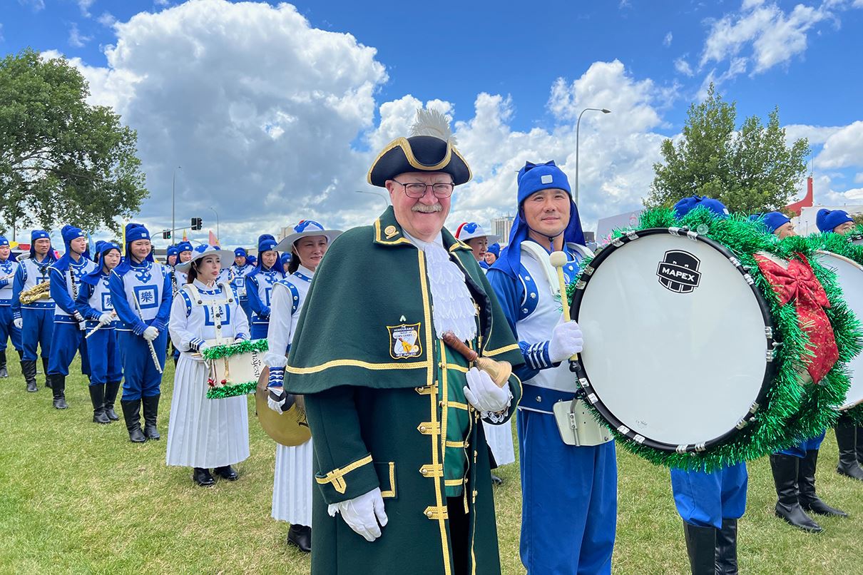 城市公告员(Town Crier)莱尔·布兰登(Lyal Brenton)是北帕游行的领队。他认为法轮功学员的服装棒极了(fantastic),看上去很美(lovely)。