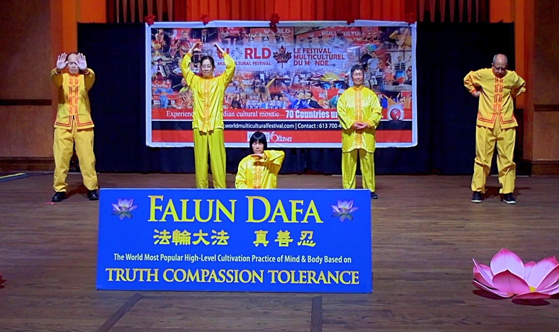 法轮功的功法展示在众多演出中显得格外祥和、美好。法轮功学员忻女士接受采访时说:“法轮功功法展示的音乐一响起,喧嚣的环境立刻就安静下来,气氛特别祥和、美好。五位学员各做一套功法,还有一位学员向观众介绍法轮大法和每套功法。” 许多观众拿到了介绍法轮大法的传单,也有观众后来到炼功点学功。