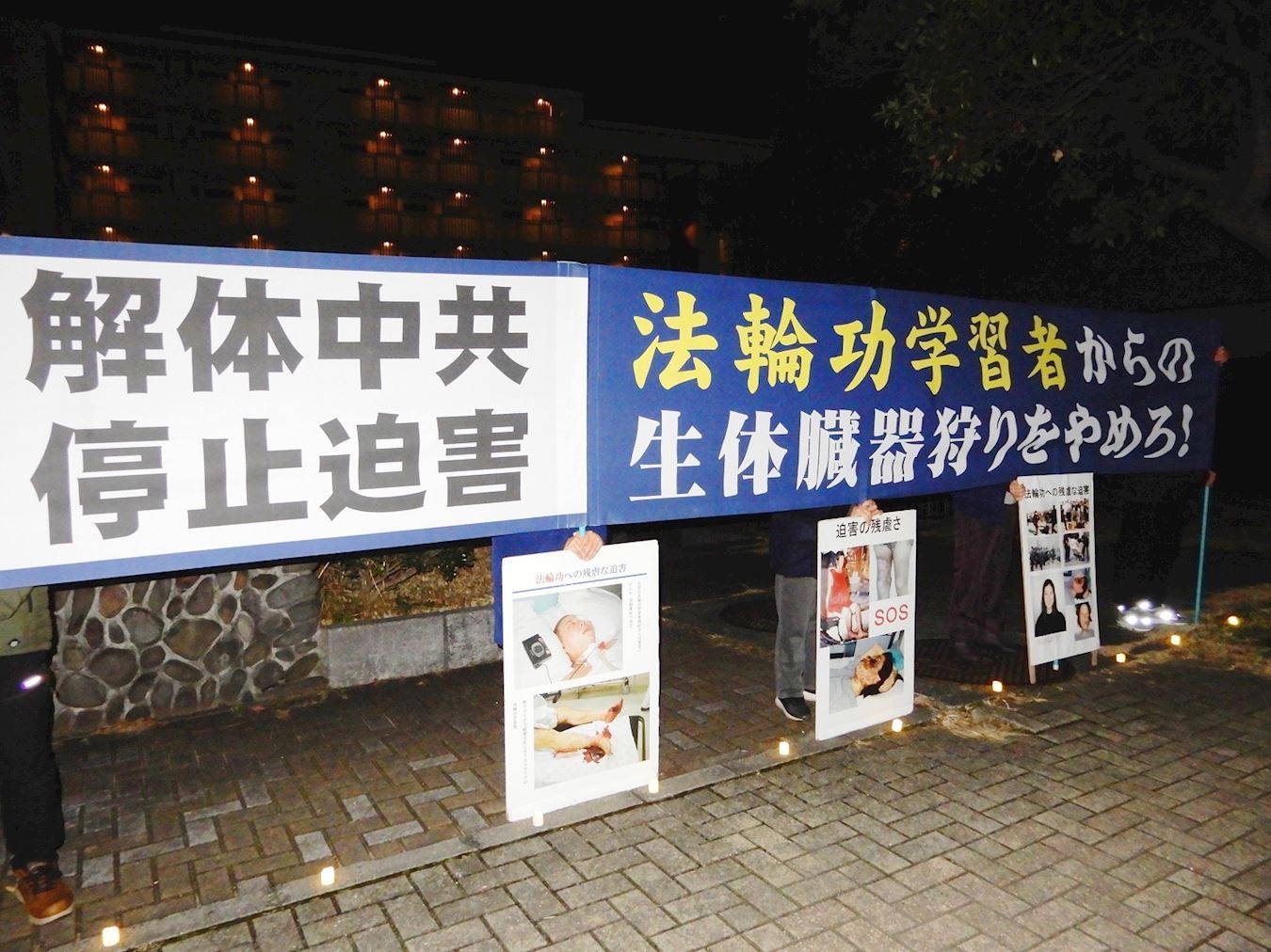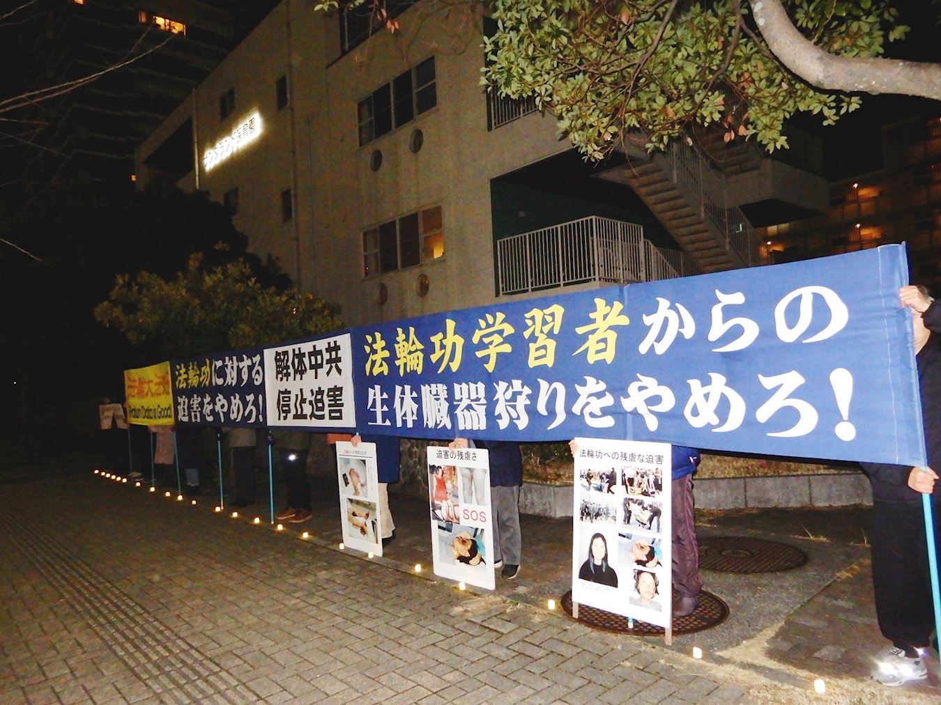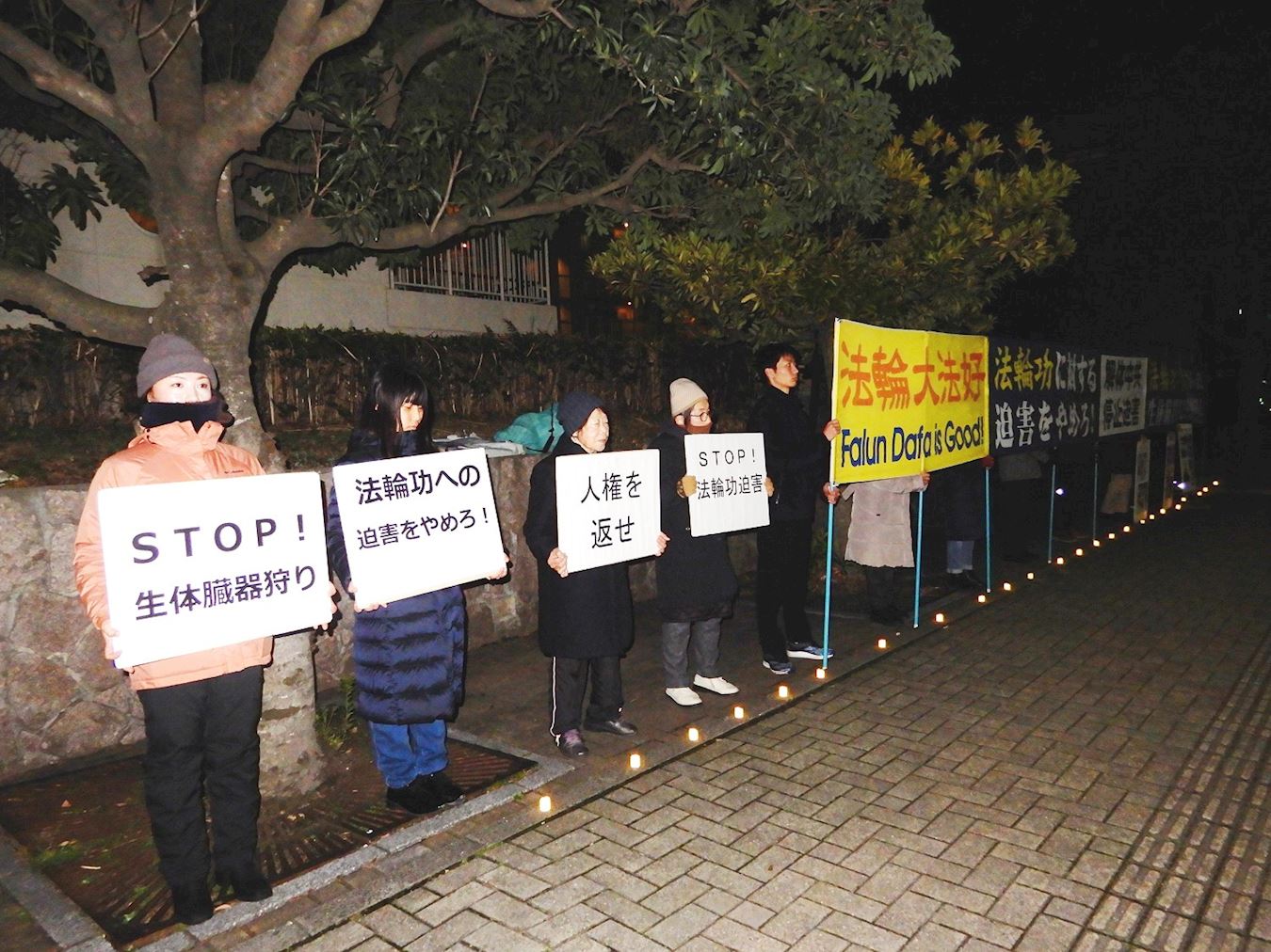 路过的行人驻足在真相展板前,认真阅读真相内容,也有不少车辆拉下窗户接过学员递送的真相资料。寒风中夜幕降临,学员们在横幅下点起烛光,醒目的横幅和标语牌,一盏盏烛光彷佛在唤醒人们善念的指路明灯。