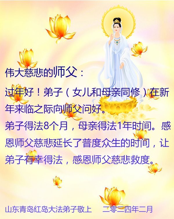 师父新年快乐!我是刚进门的新学员,感恩师父给我净化身体,多年的乙肝大三阳不翼而飞,感恩师父慈悲救度。谢谢师父!师父辛苦了!