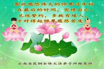 恭祝尊敬的师父新年快乐!希望我们能够提高心性和升华,帮助师父救度众生。