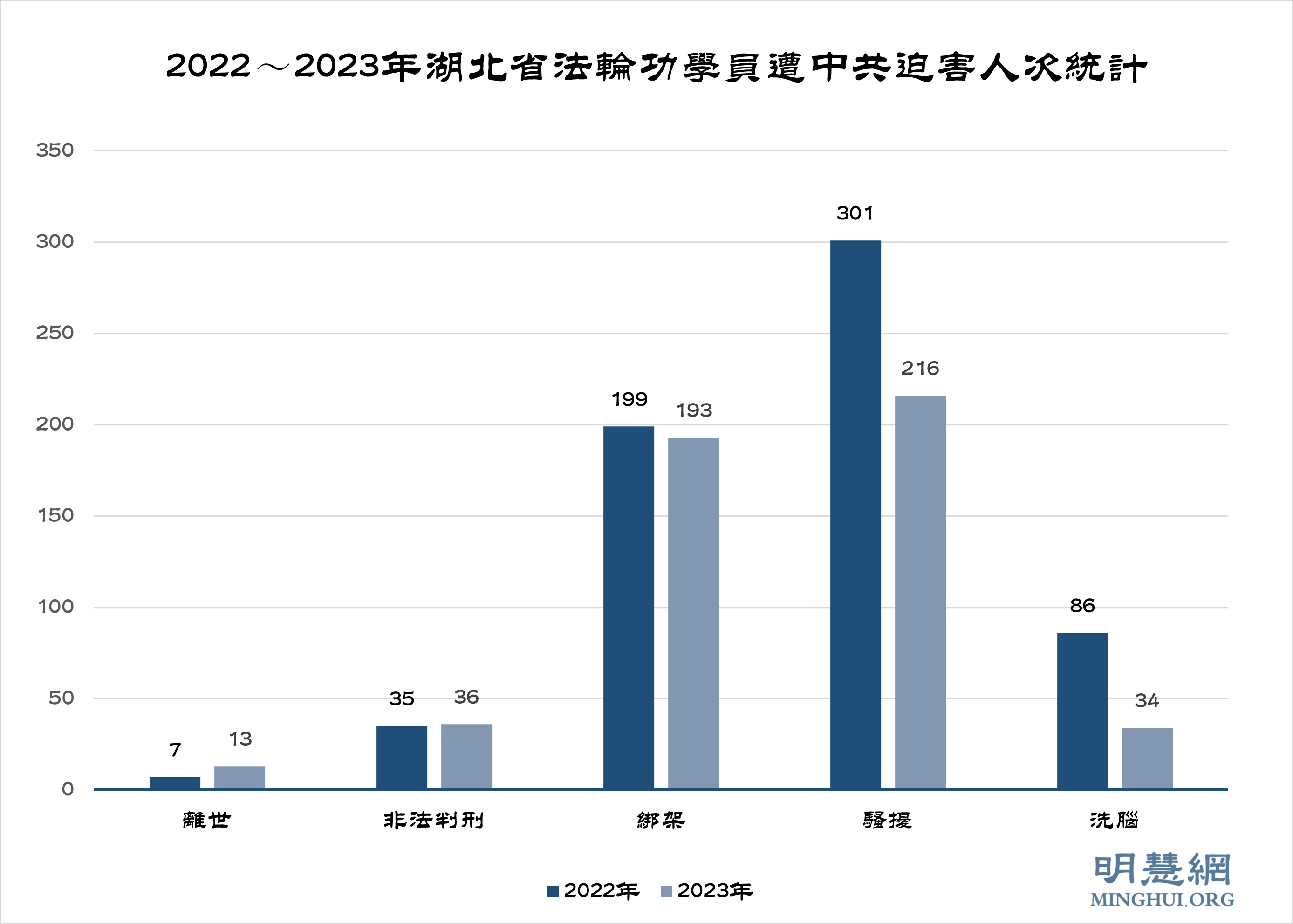 据明慧网报道的信息的不完全统计,二零二二年和二零二三年,湖北省至少有1213名(次)法轮功学员受到了不同形式的迫害,其中20位被迫害致死或含冤离世,71位被非法判刑、被勒索罚款累计23.6万元,39位被构陷到检察院、法院,392位被绑架,120位被非法关洗脑班,5位被关进精神病院遭药物迫害,另外,还有517位被骚扰,49位遭经济、工作迫害,如被法院罚款、警察勒索抢劫、被非法扣除养老金、绩效工资、被非法剥夺编制、被迫辞职、被强制解除劳动合同、被强制退休等。