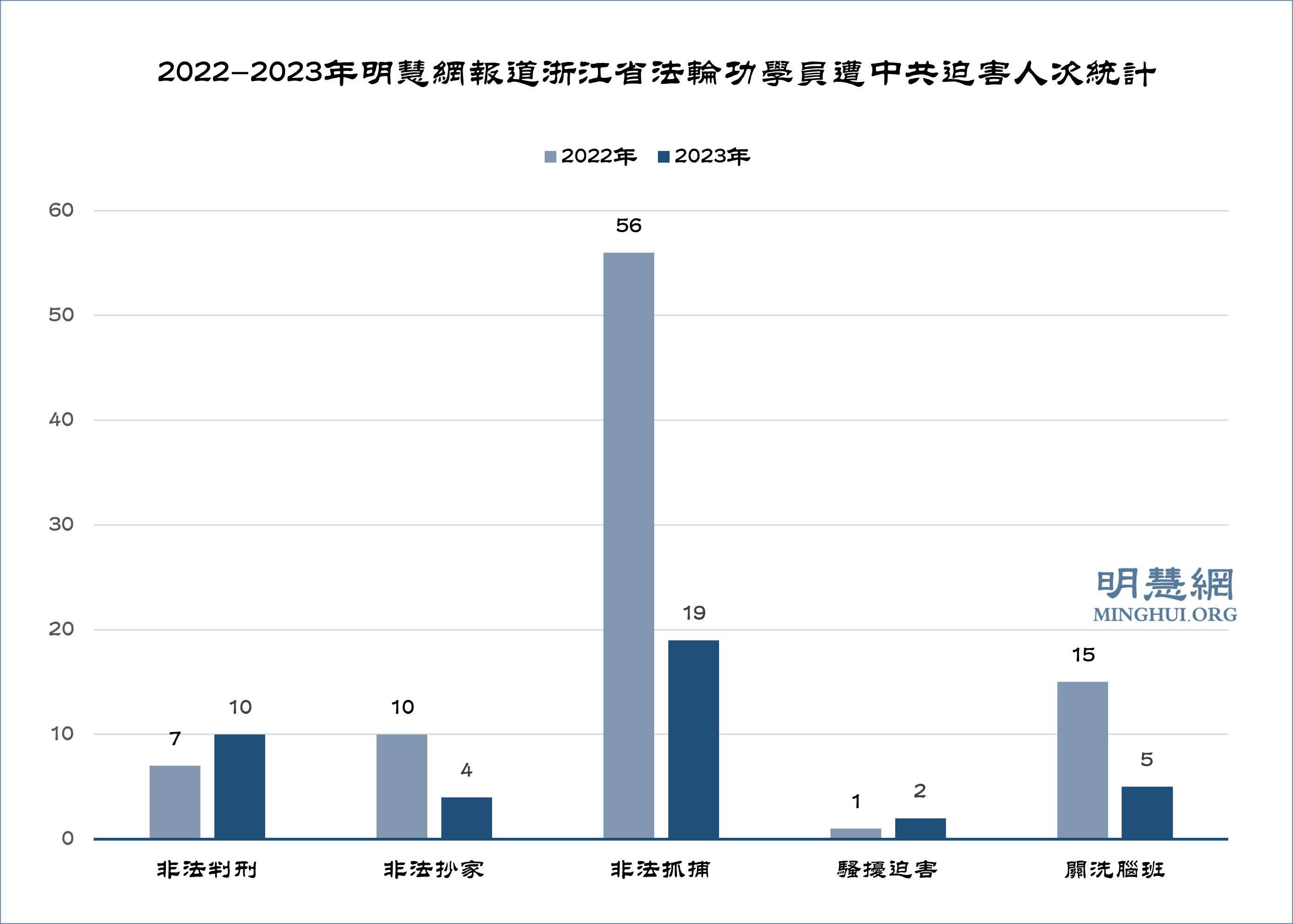 【明慧网二零二四年二月三日】据明慧网报道的信息统计,二零二二年和二零二三年,浙江省法轮功学员因为信仰真、善、忍,被中共当局迫害,至少17人被非法判刑,75人次被绑架,3人次被骚扰,20人次被洗脑班迫害;总计至少115人次被迫害。被绑架和骚扰的法轮功学员中,至少14人次被非法抄家(搜身等)。由于中共对真相的封锁、不允许家人探视、暗地迫害等原因,还有许多没有报道出来的迫害事实。