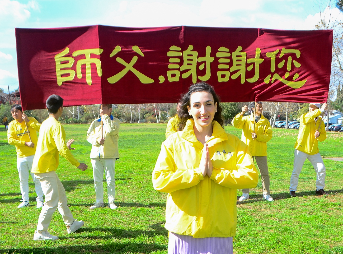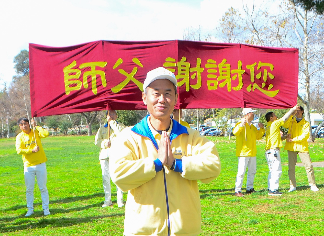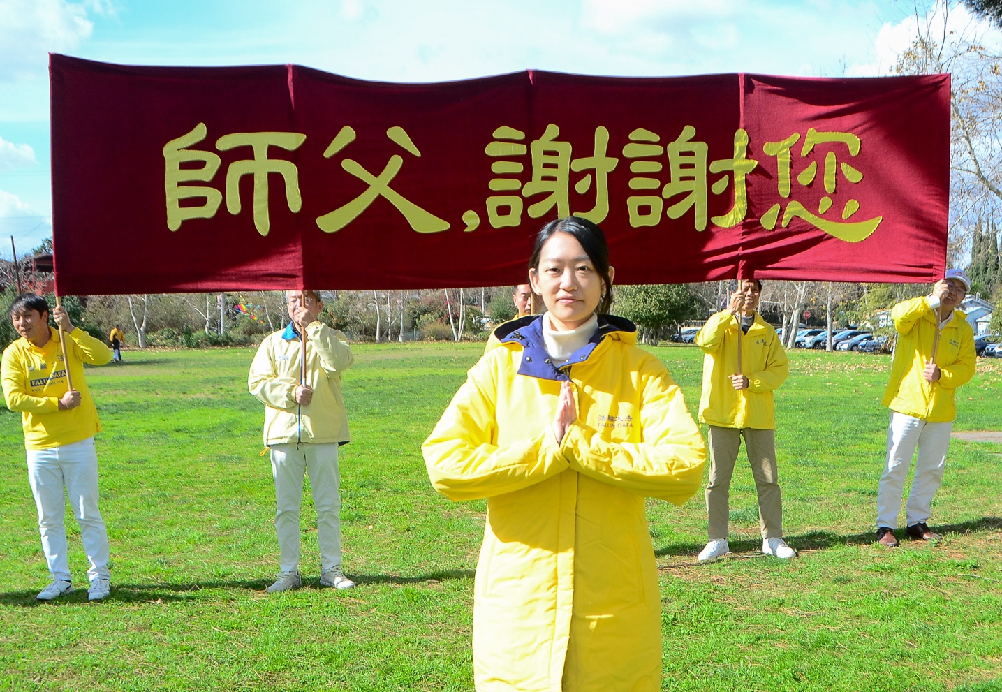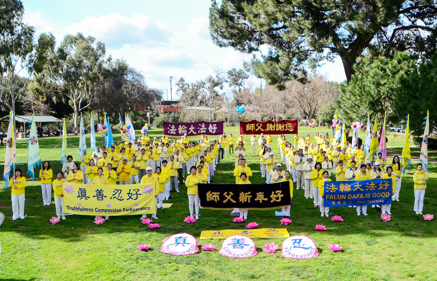 法轮功学员们手持横幅:“恭祝师尊新年好”、“师父,谢谢您”、“法轮大法好”、“真善忍好”,表达他们由衷的心声;他们齐声虔诚地道出:“恭祝师尊新年好! ”声音迥荡在兰天白云 、辽阔的天空。