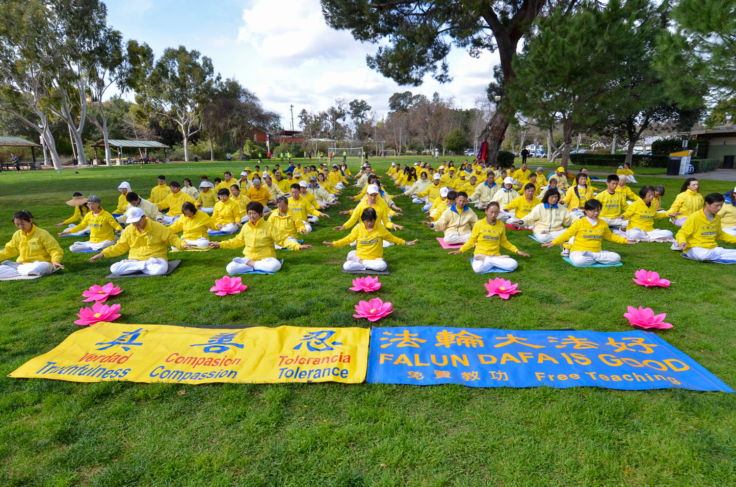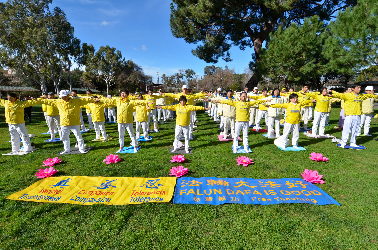 ![]() 图2~3:二零二四年二月三日,洛杉矶部分法轮功学员齐聚在华人区圣盖博市的文森特卢果公园(Vincent Lugo Park)集体炼功,向李洪志师父恭贺新年。 |