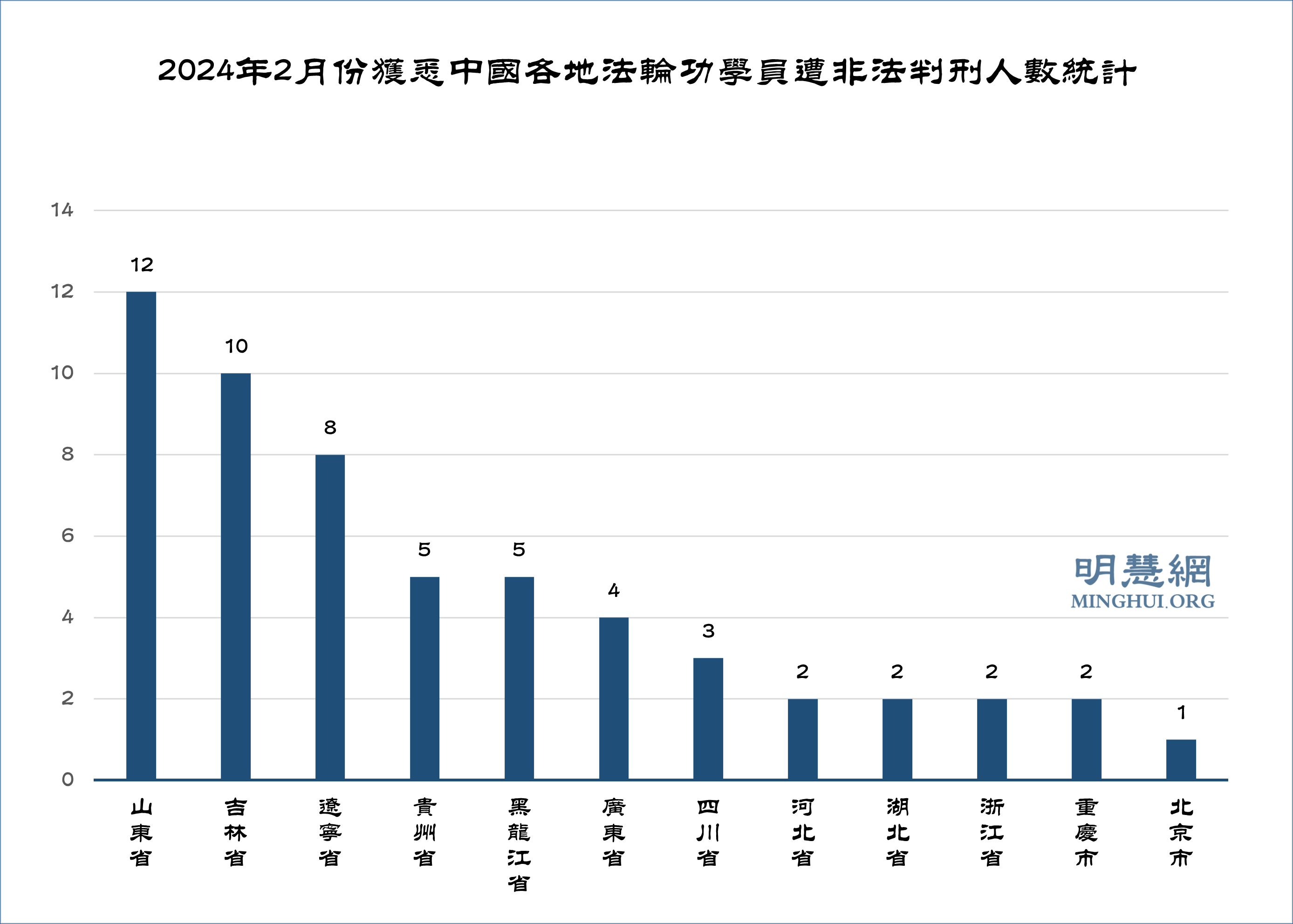 据明慧网报道统计,二零二四年二月份获知56名法轮功学员被非法判刑。非法判刑最严重地区依次为:山东12人、吉林10人、辽宁8人;贵州、黑龙江各5人、广东4人、四川3人;河北、湖北、浙江、重庆市各2人;北京市1人。