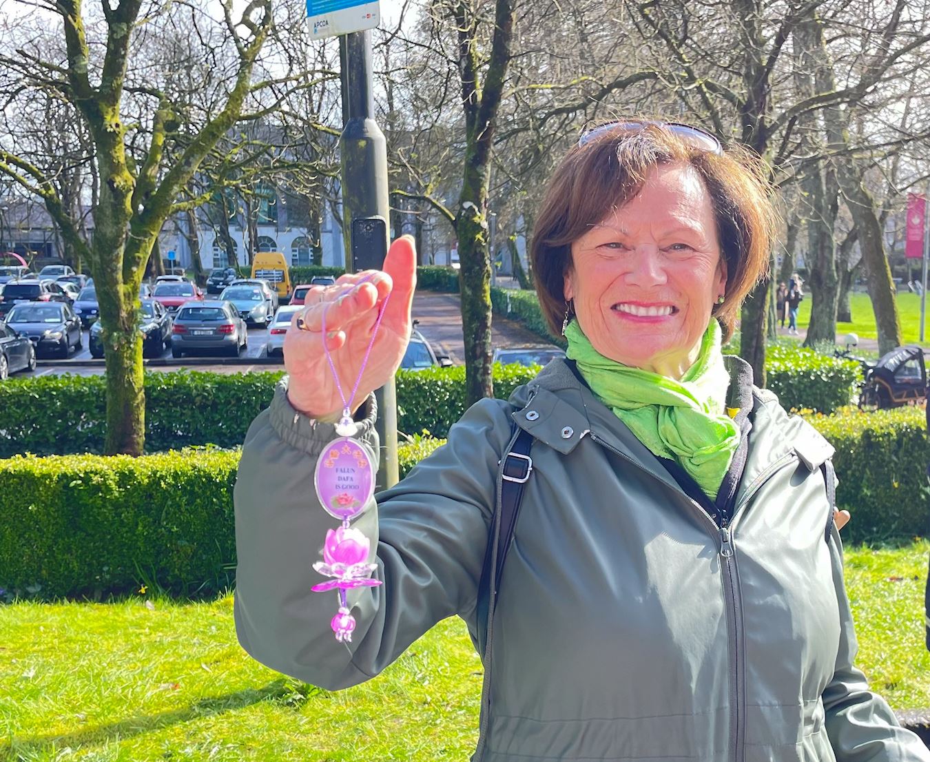 图4:爱尔兰观众派翠莎手举真善忍小莲花,称赞法轮功方阵:“太棒了!”