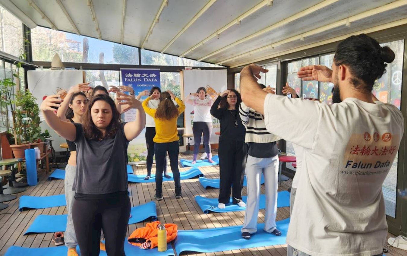图2:二零二四年三月十日,法轮功学员在伊斯坦布尔(Istanbul)卡德柯伊(Kadıköy)的生态生活中心举办法轮大法介绍会。图为到场的人们在学炼功法。