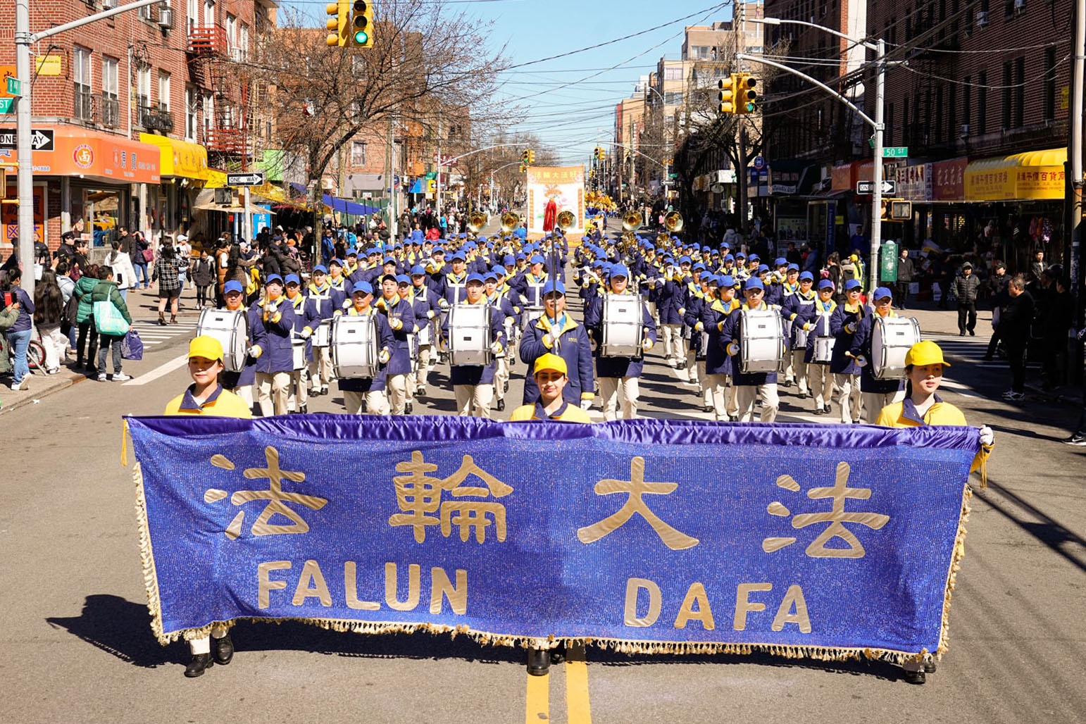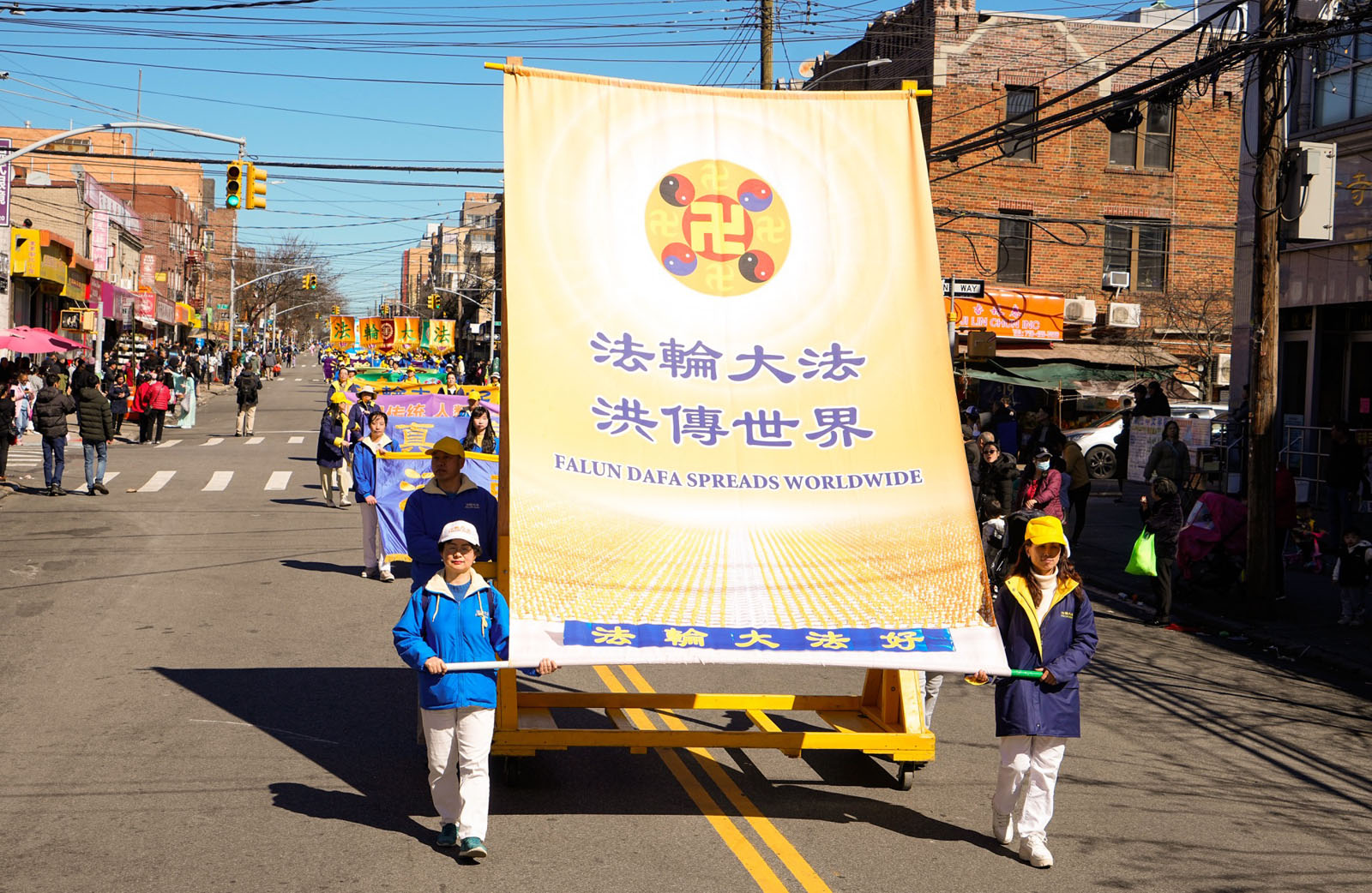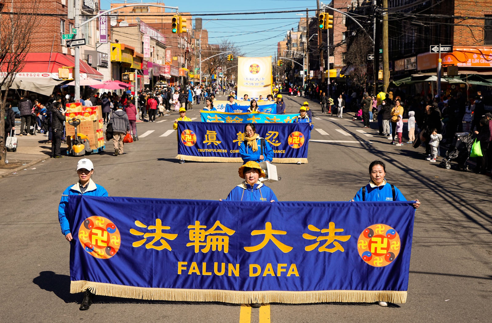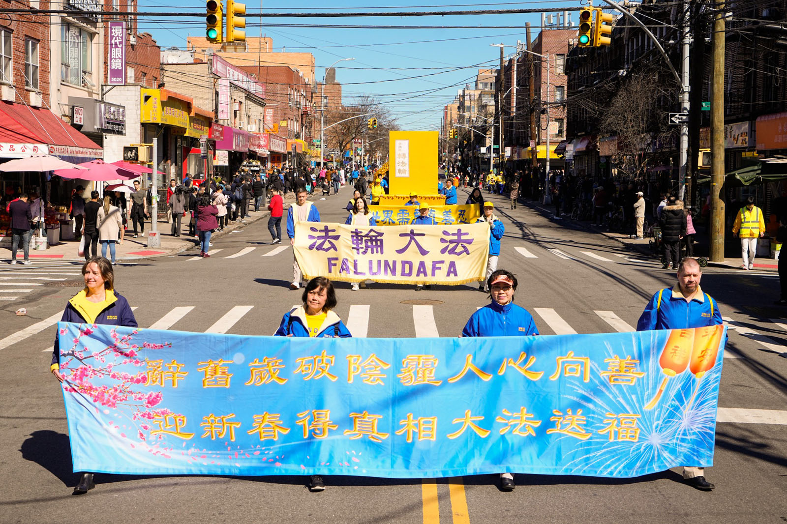 周末的八大道人声鼎沸,游行队伍从起点第四十一街到终点第五十九街,一直绵延了十几条街,整个社区喜气洋洋。庄严威武的乐队,欢舞飞腾的狮龙,彩旗飘扬,鼓声震天,横幅展板,花船腰鼓,场面殊胜壮观,震撼人心。众多市民及游客站在街头目不暇接,拍照、录像、喜迎真相。