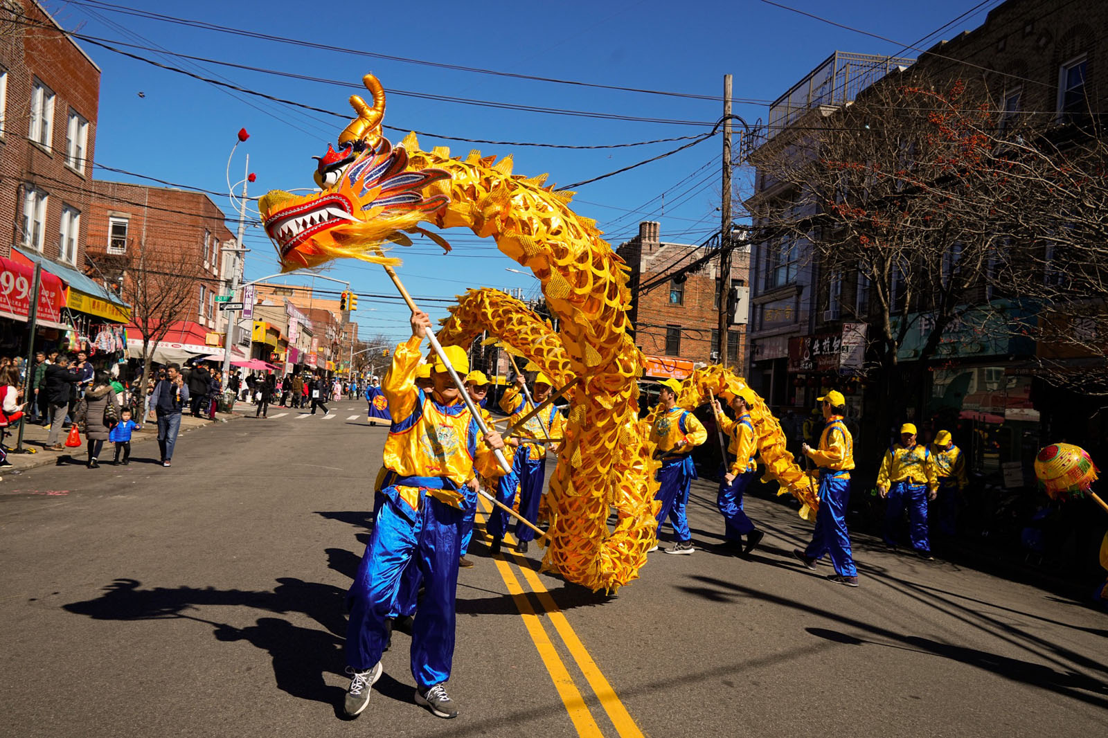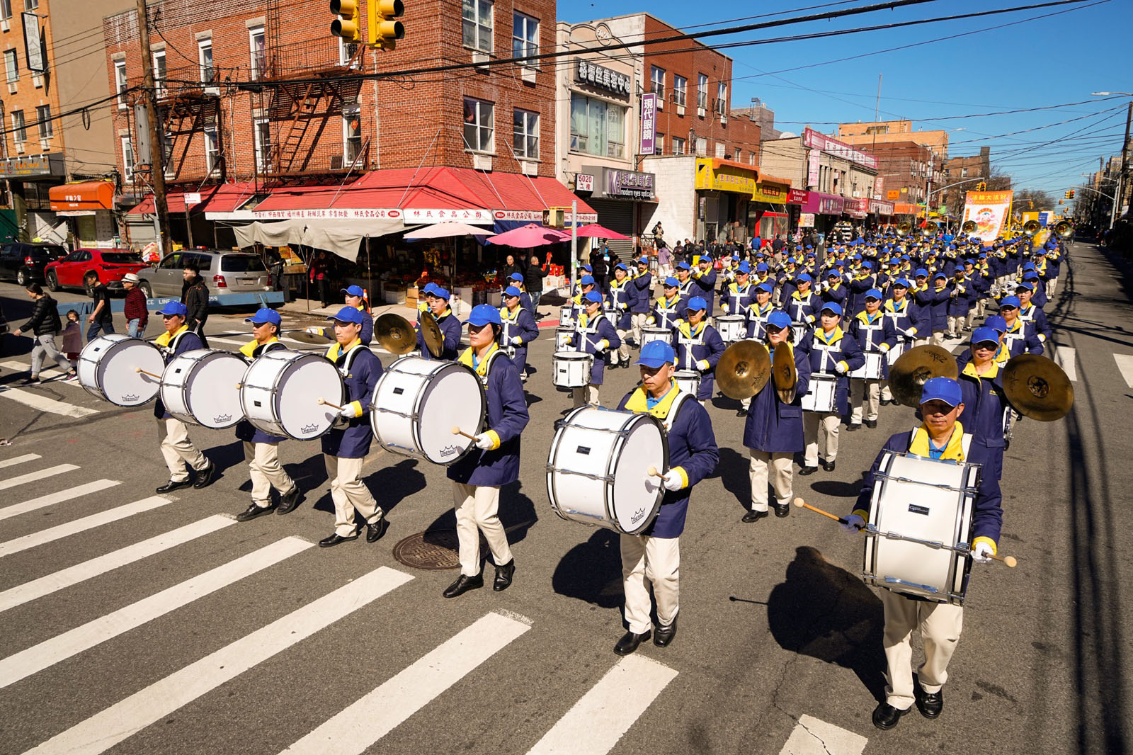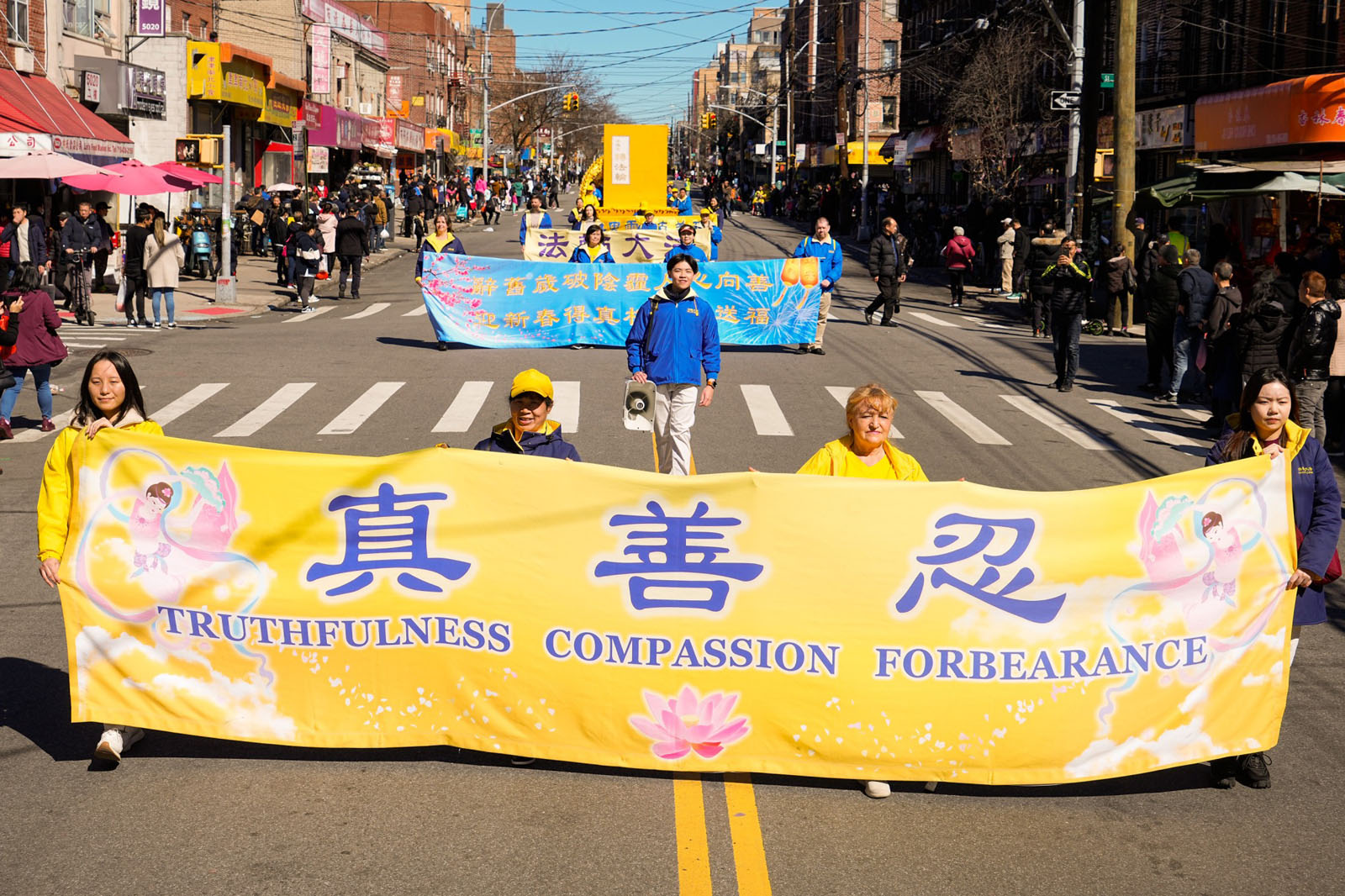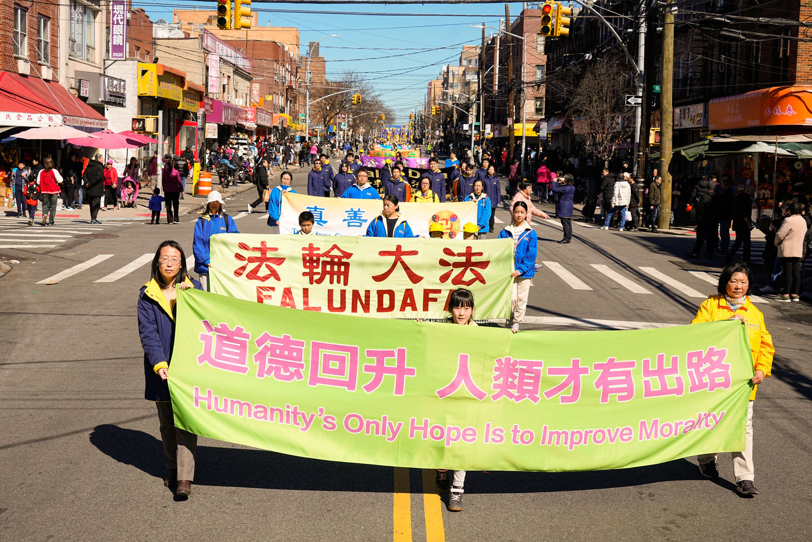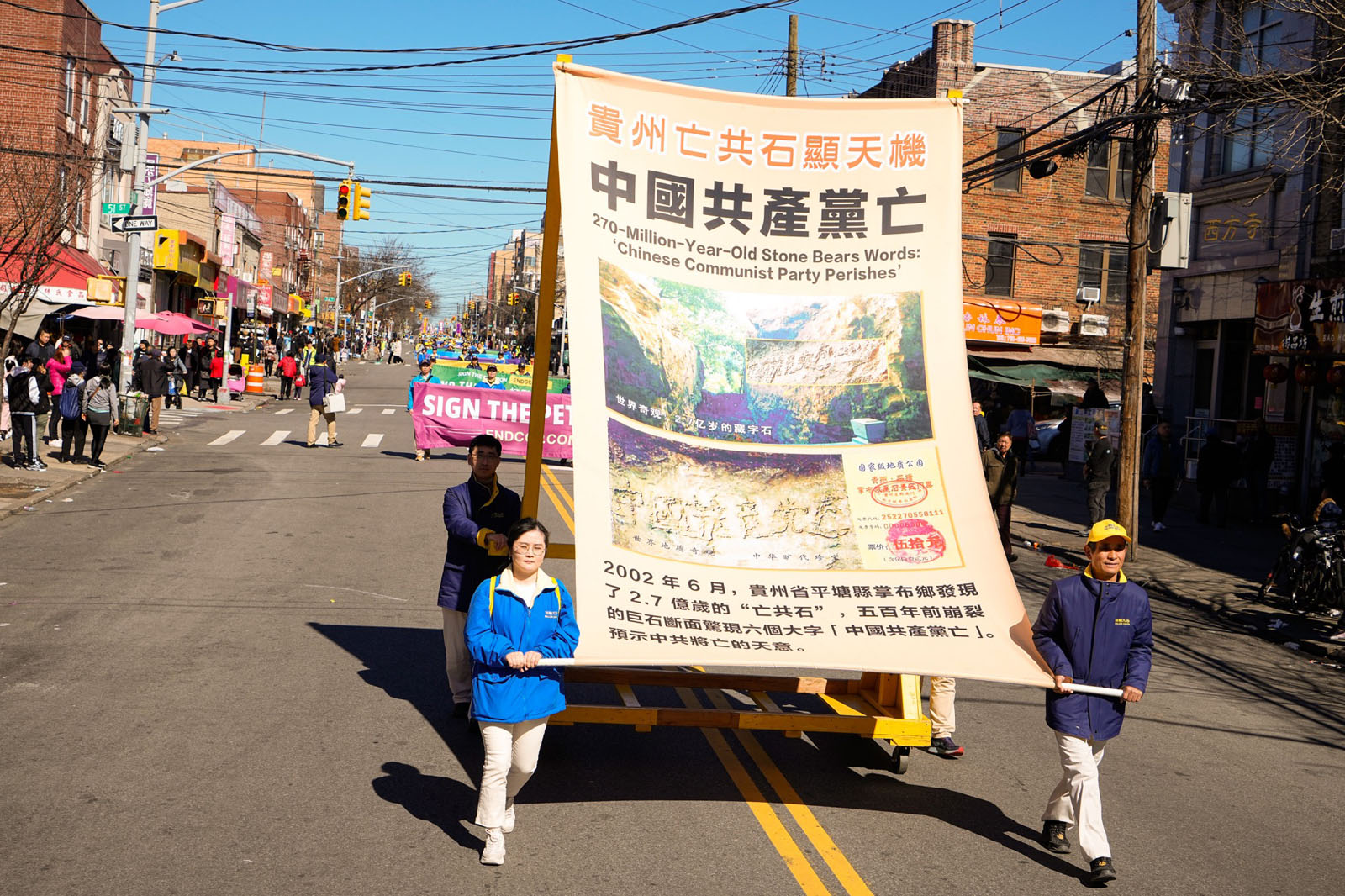 周末的八大道人声鼎沸,游行队伍从起点第四十一街到终点第五十九街,一直绵延了十几条街,整个社区喜气洋洋。庄严威武的乐队,欢舞飞腾的狮龙,彩旗飘扬,鼓声震天,横幅展板,花船腰鼓,场面殊胜壮观,震撼人心。众多市民及游客站在街头目不暇接,拍照、录像、喜迎真相。