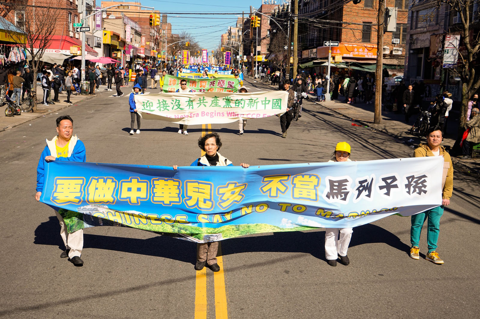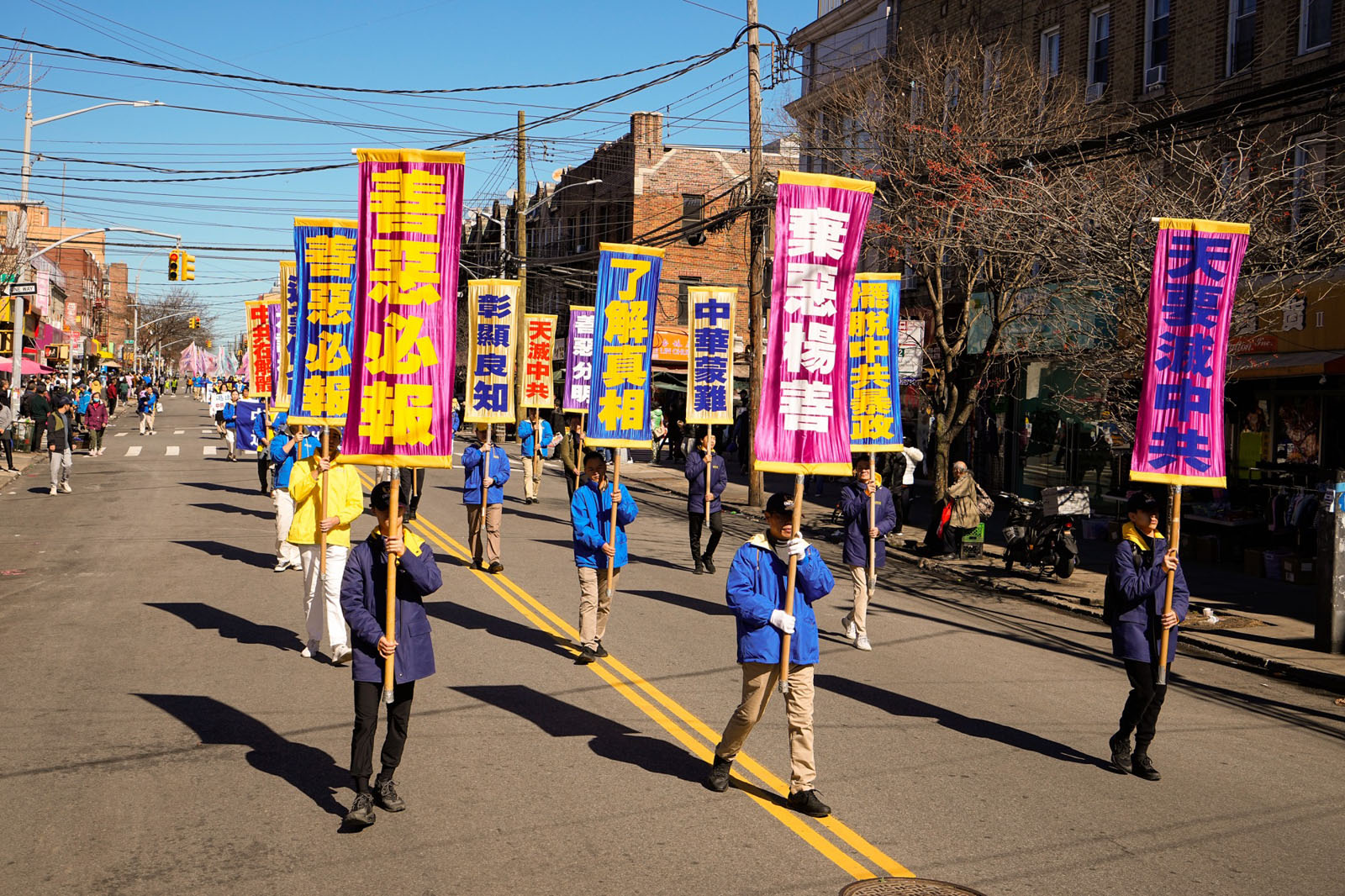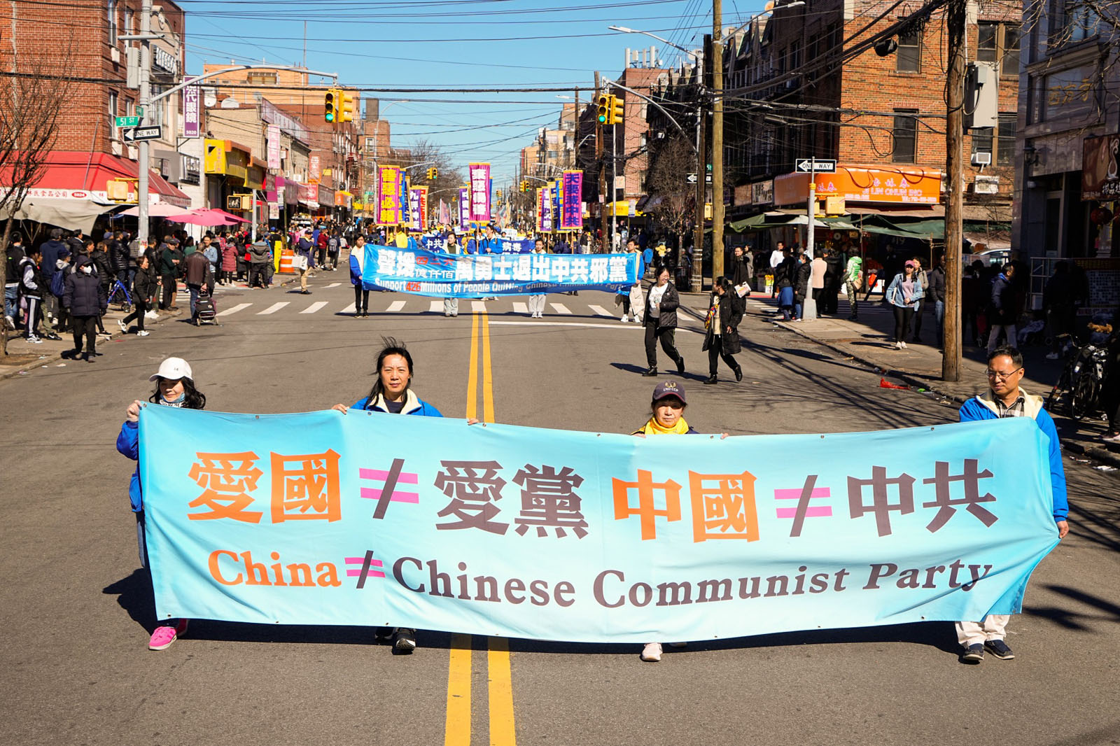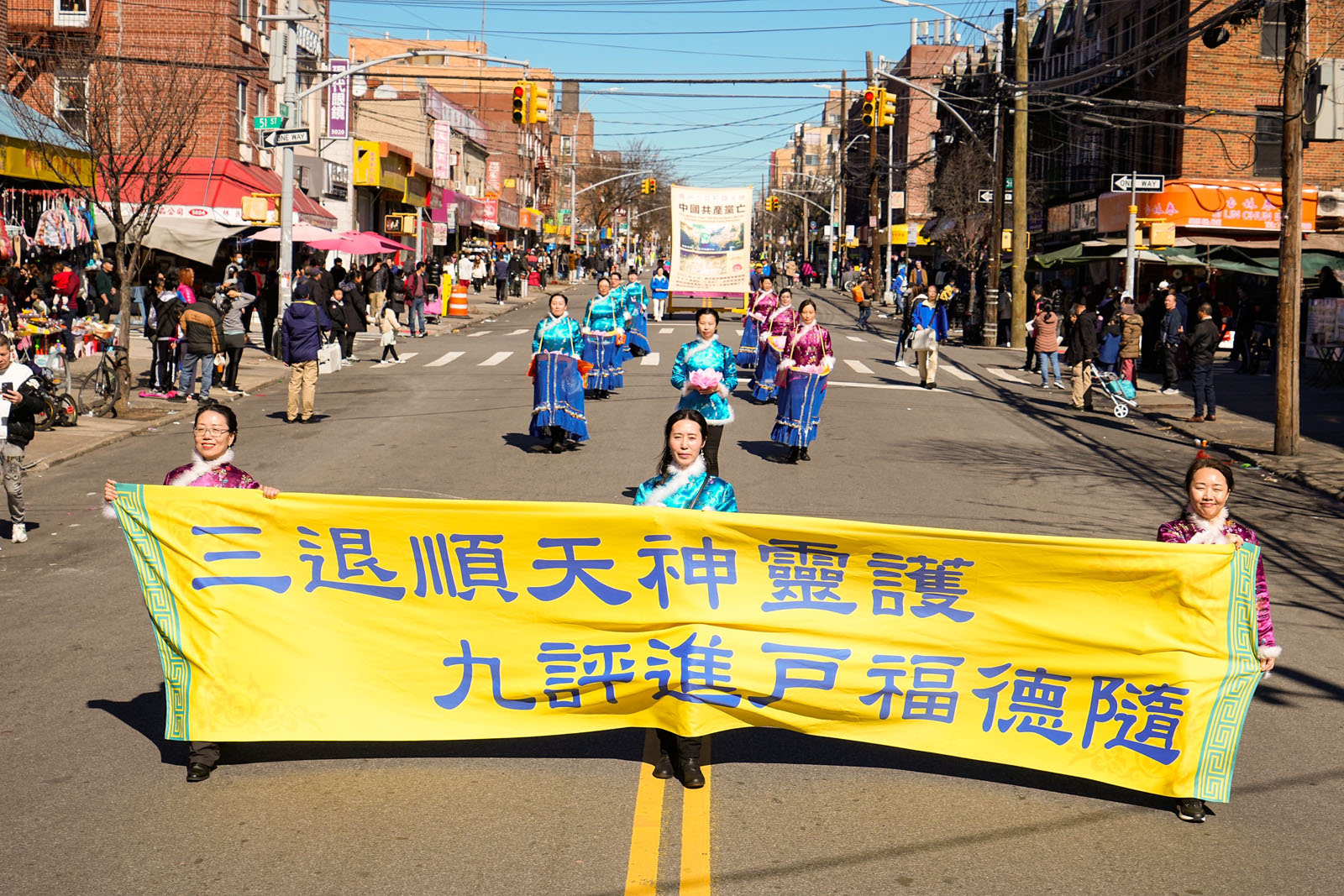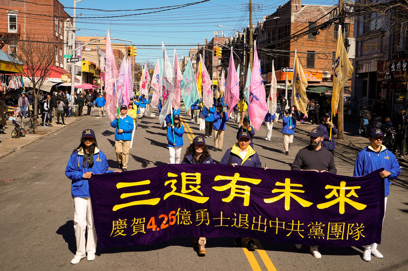 图1~9:二零二四年三月三日,纽约第三大华人社区——布鲁克林八大道上,近千名法轮功学员举行庆祝4.2亿中国人三退大游行。