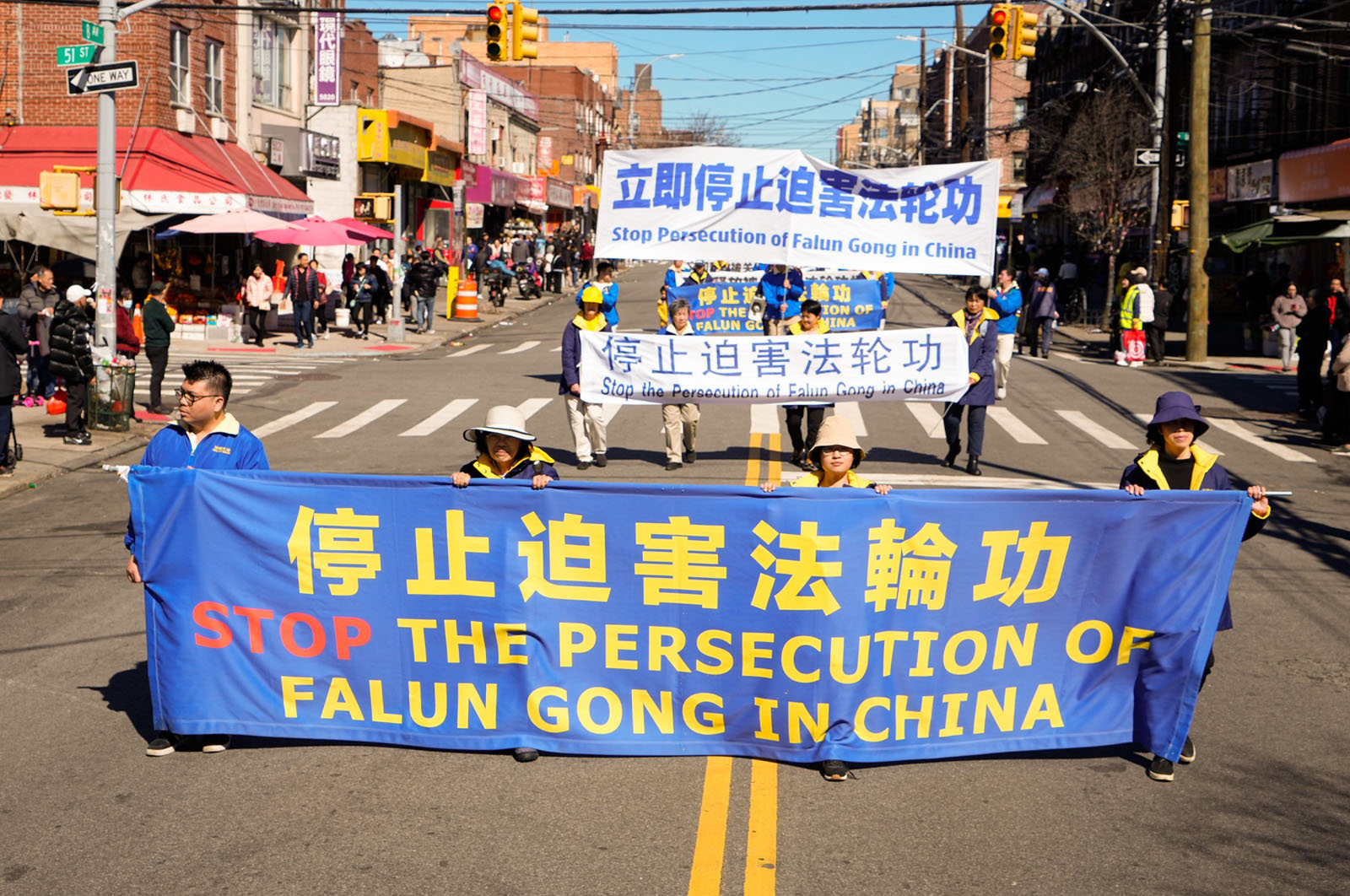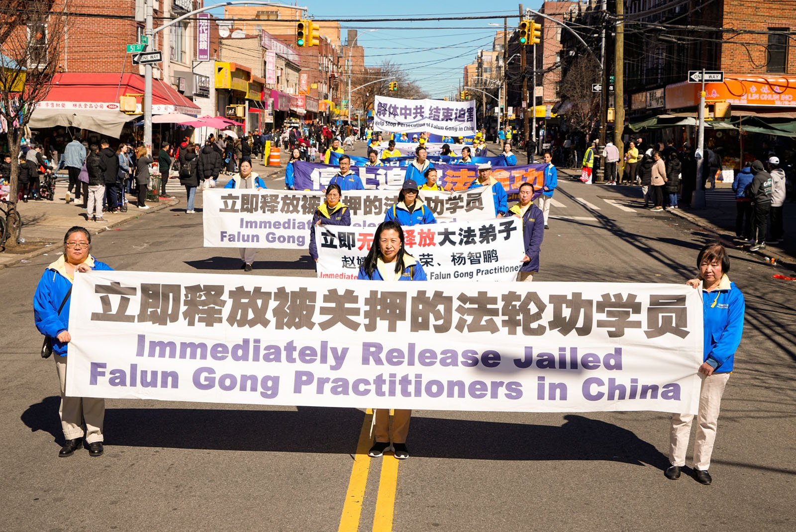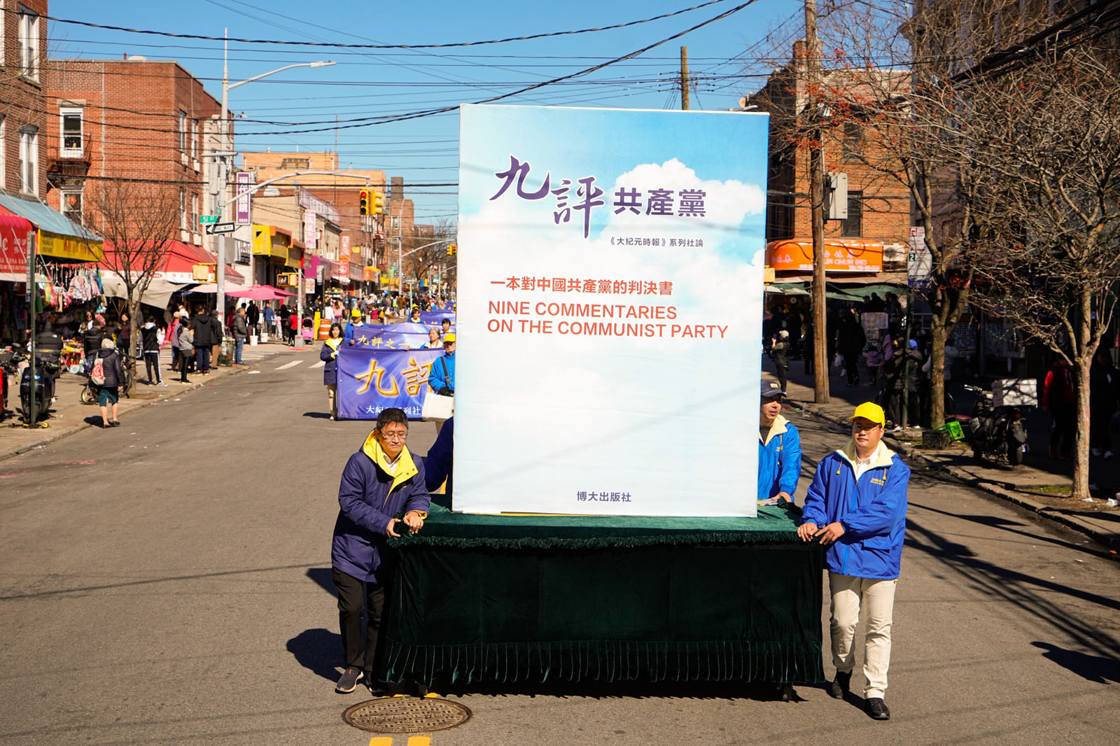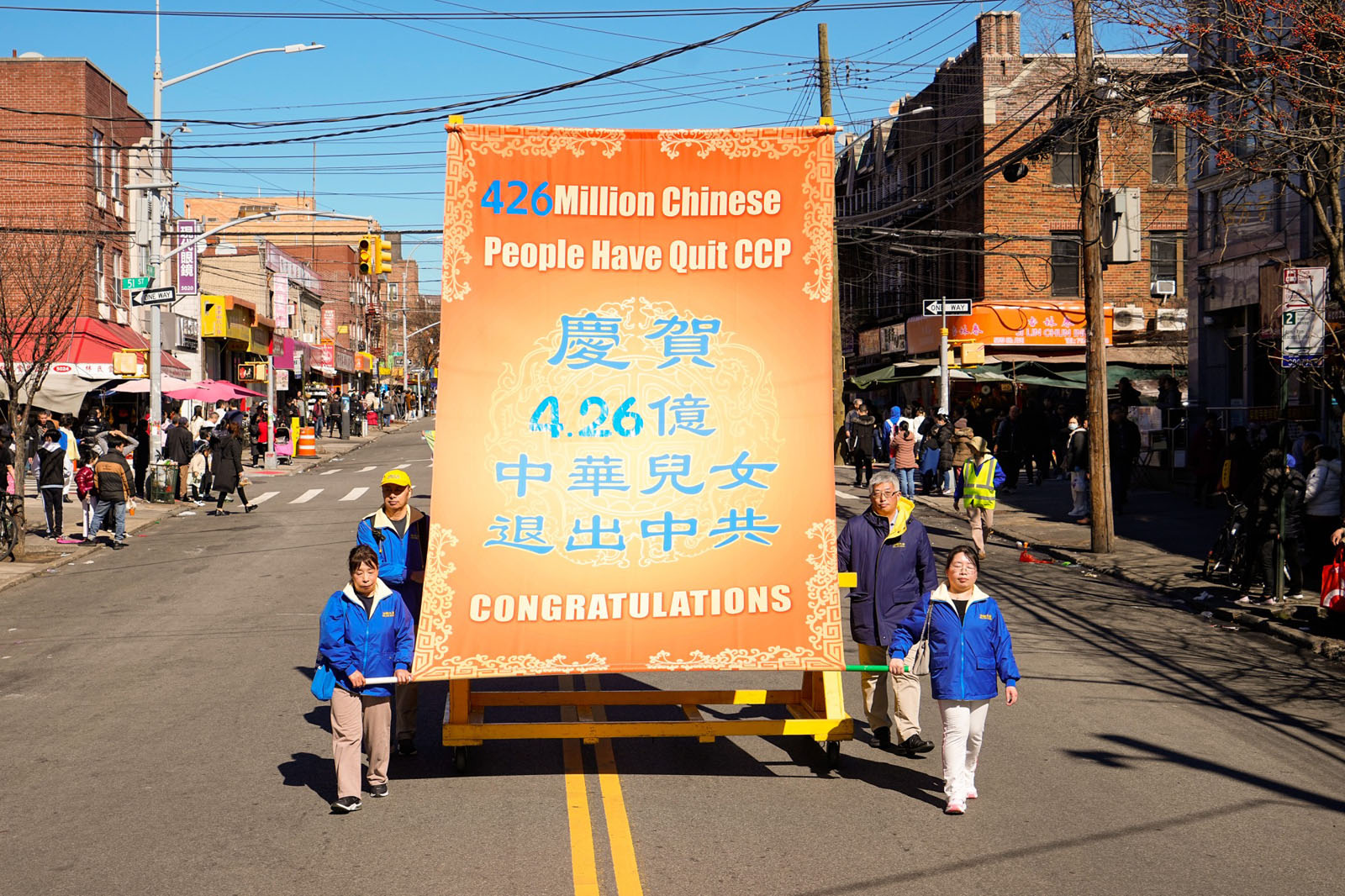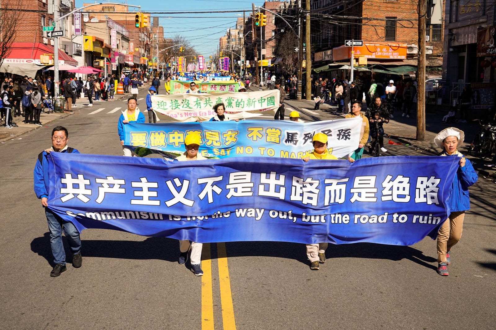 图1~9:二零二四年三月三日,纽约第三大华人社区——布鲁克林八大道上,近千名法轮功学员举行庆祝4.2亿中国人三退大游行。