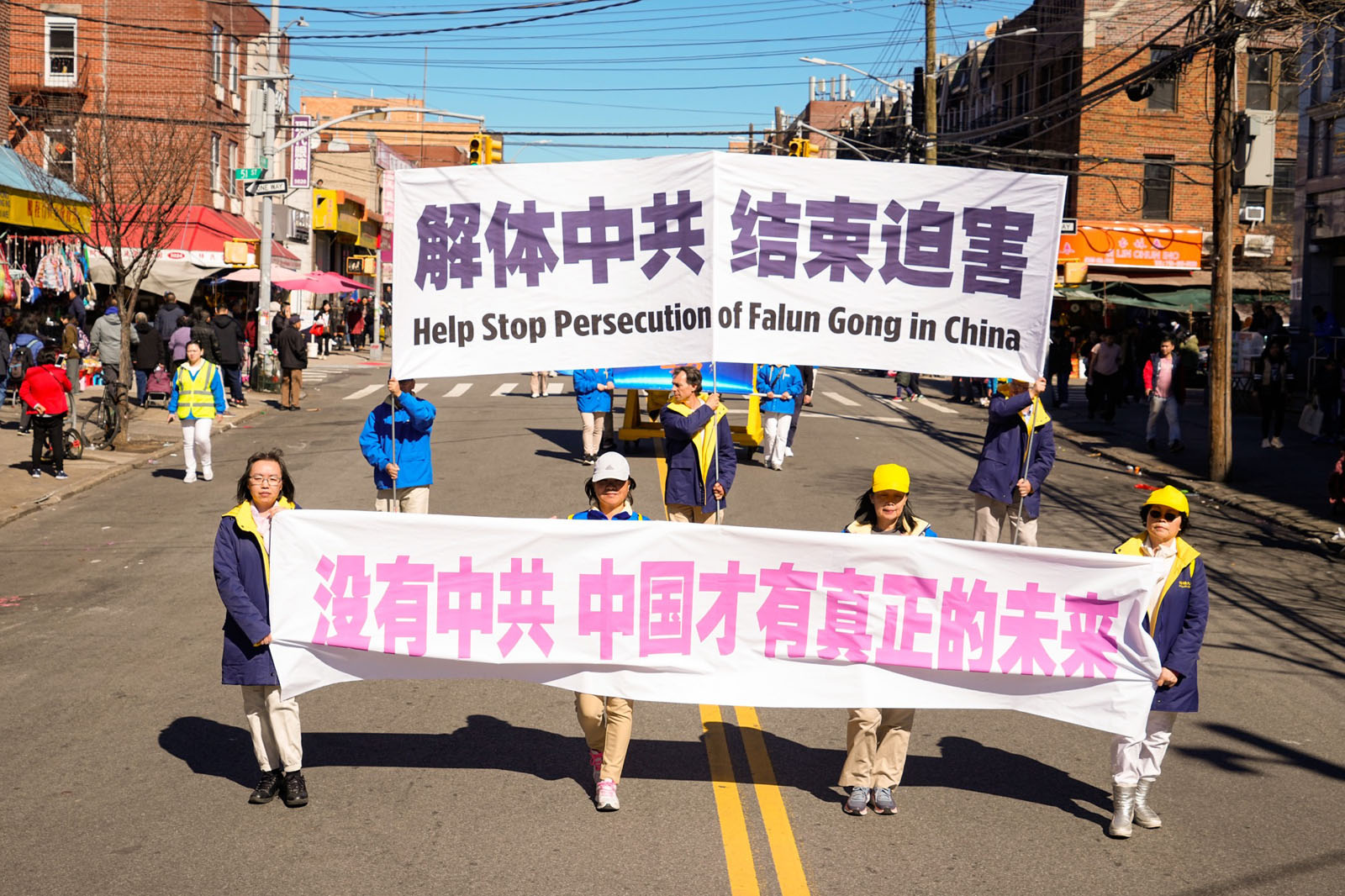 图1~8:二零二四年三月三日,纽约第三大华人社区——布鲁克林八大道上,近千名法轮功学员举行庆祝4.2亿中国人三退大游行。