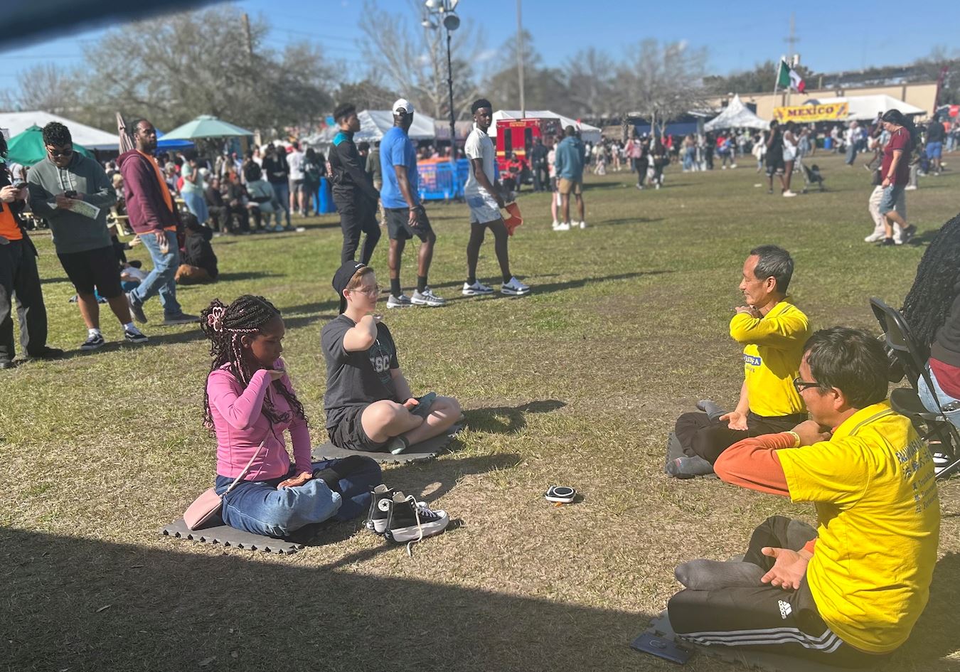 一对来自另一个非营利展位区的夫妇也对修炼表现出兴趣。学员向他们解释什么是法轮大法,这位女士不断地说:“这是我想要的!”随即她也加入学炼打坐。