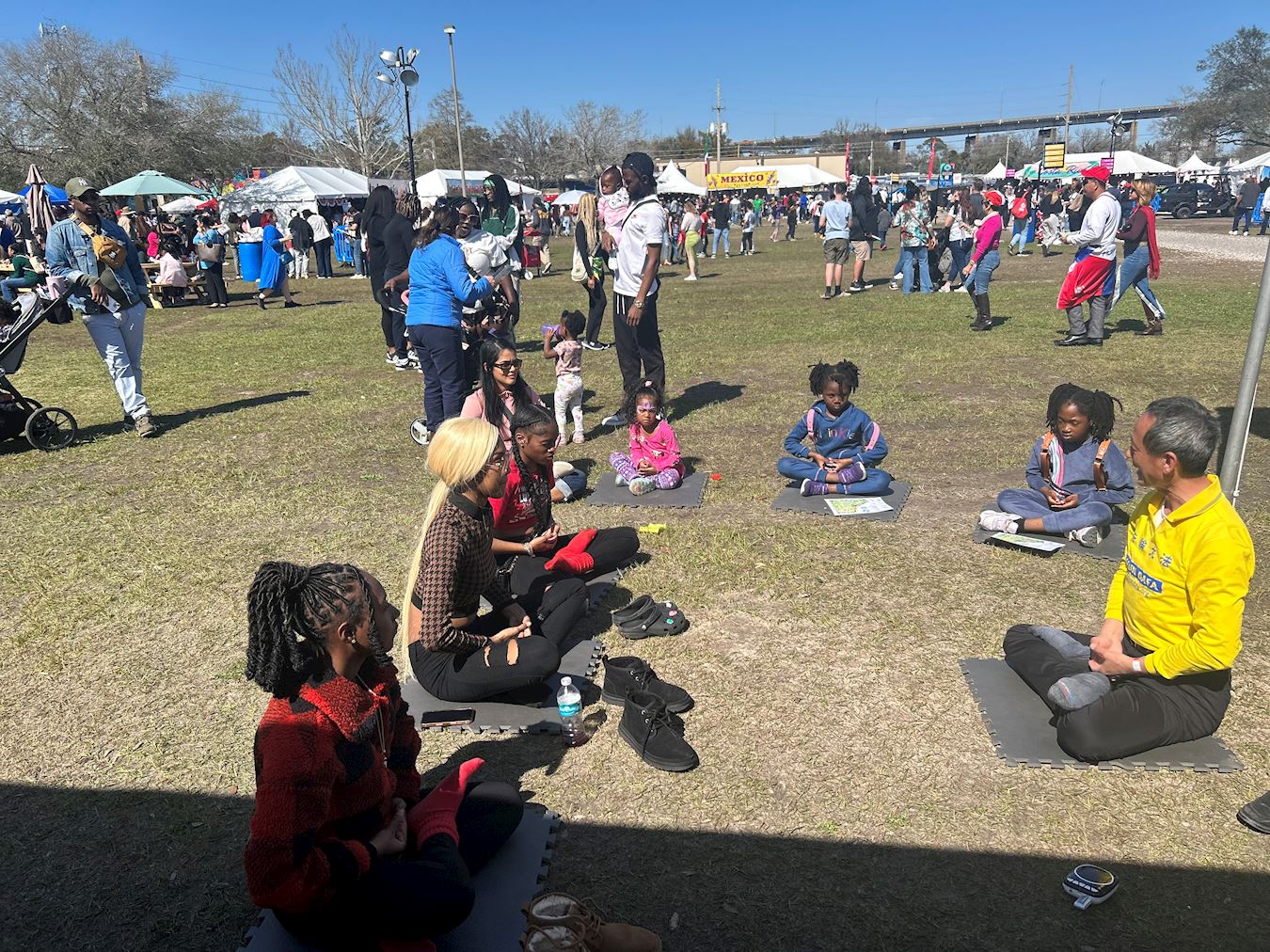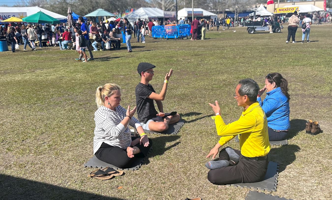 法轮功学员的展位位于非营利组织专区,在喧嚣之中,这里是一片宁静祥和的绿洲,吸引众人纷纷驻足。当他们看到学员炼舒缓祥和的五套功法时,许多人都想当场学功。学员们还发放真相传单,向大家介绍中国正在发生的迫害和活摘器官的罪行。
