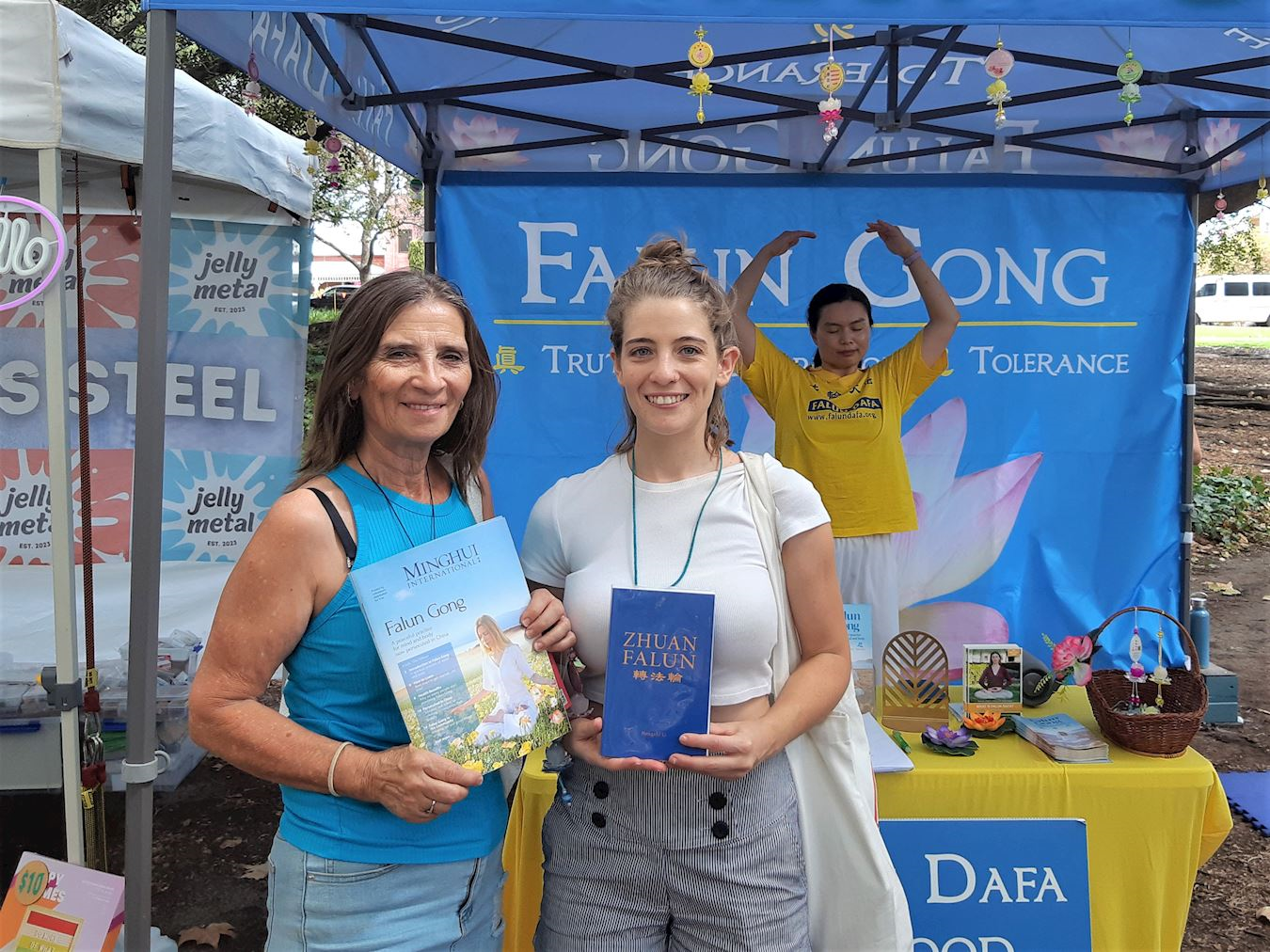 加利根(Chloe Galligan)和史密斯(Kaitlin Smith)接过法轮功学员递来的真相资料,加利根表示很高兴在法轮功展位上获得一种新的体验。史密斯说:“我挺好奇。”她俩一致认为:“我们喜欢这种能量,所以才停下来。”