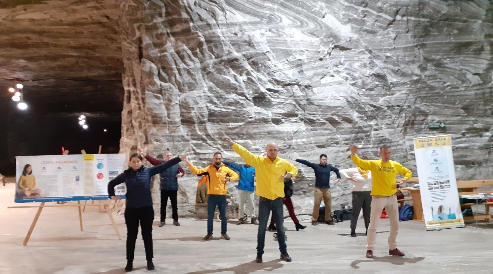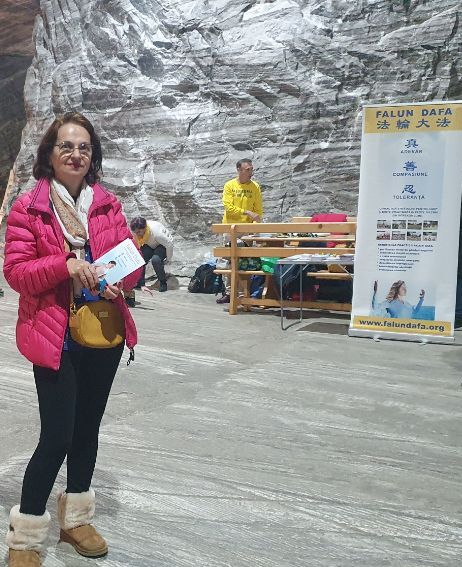 游客安德莉亚(Andreea)来自布加勒斯特,她观看学员们炼功,并与学员交谈。她表示,自己能感受到学员炼功带给她“平静和平衡”,并相信炼功音乐可以帮助她在工作中更好地集中注意力。
