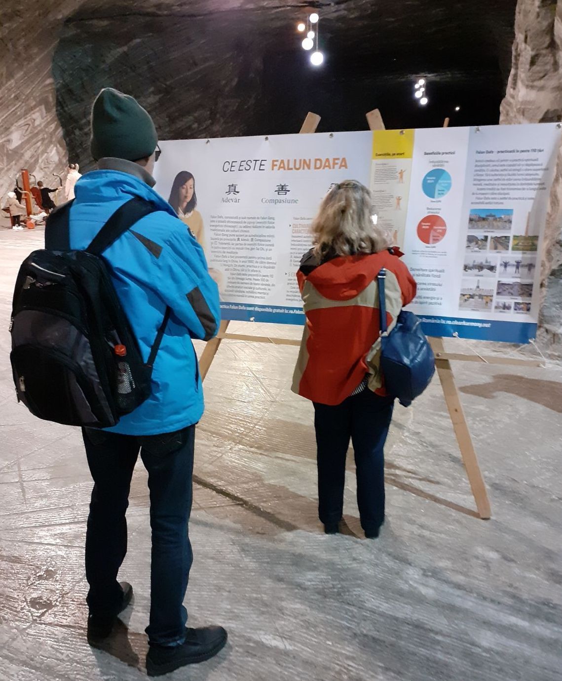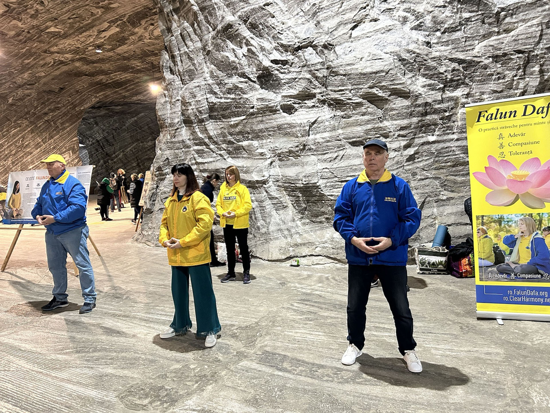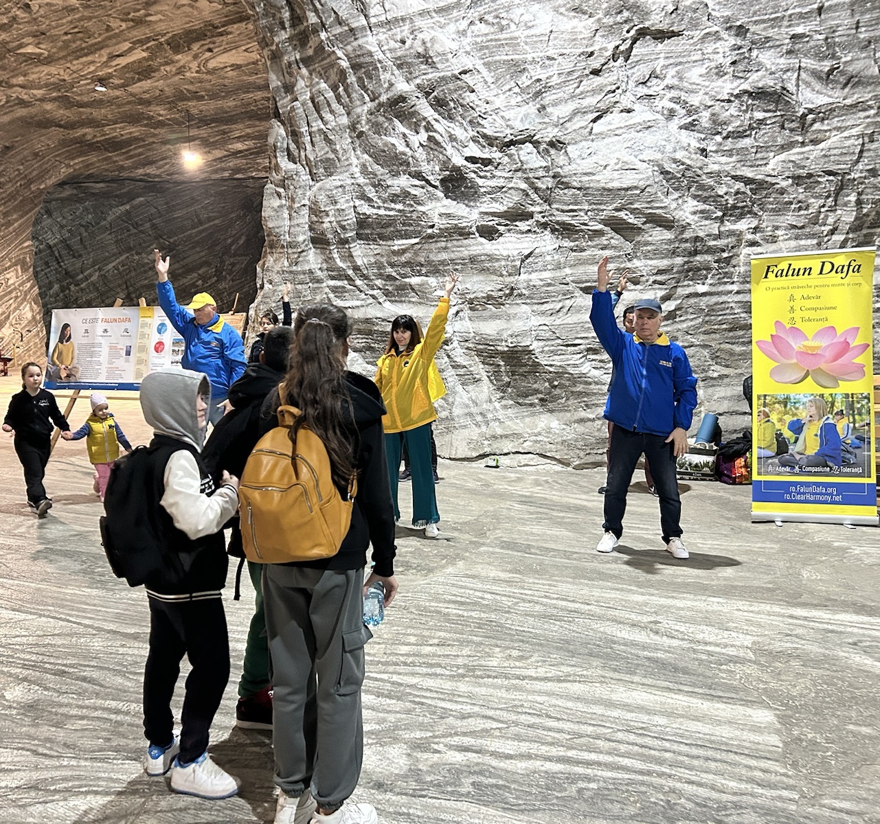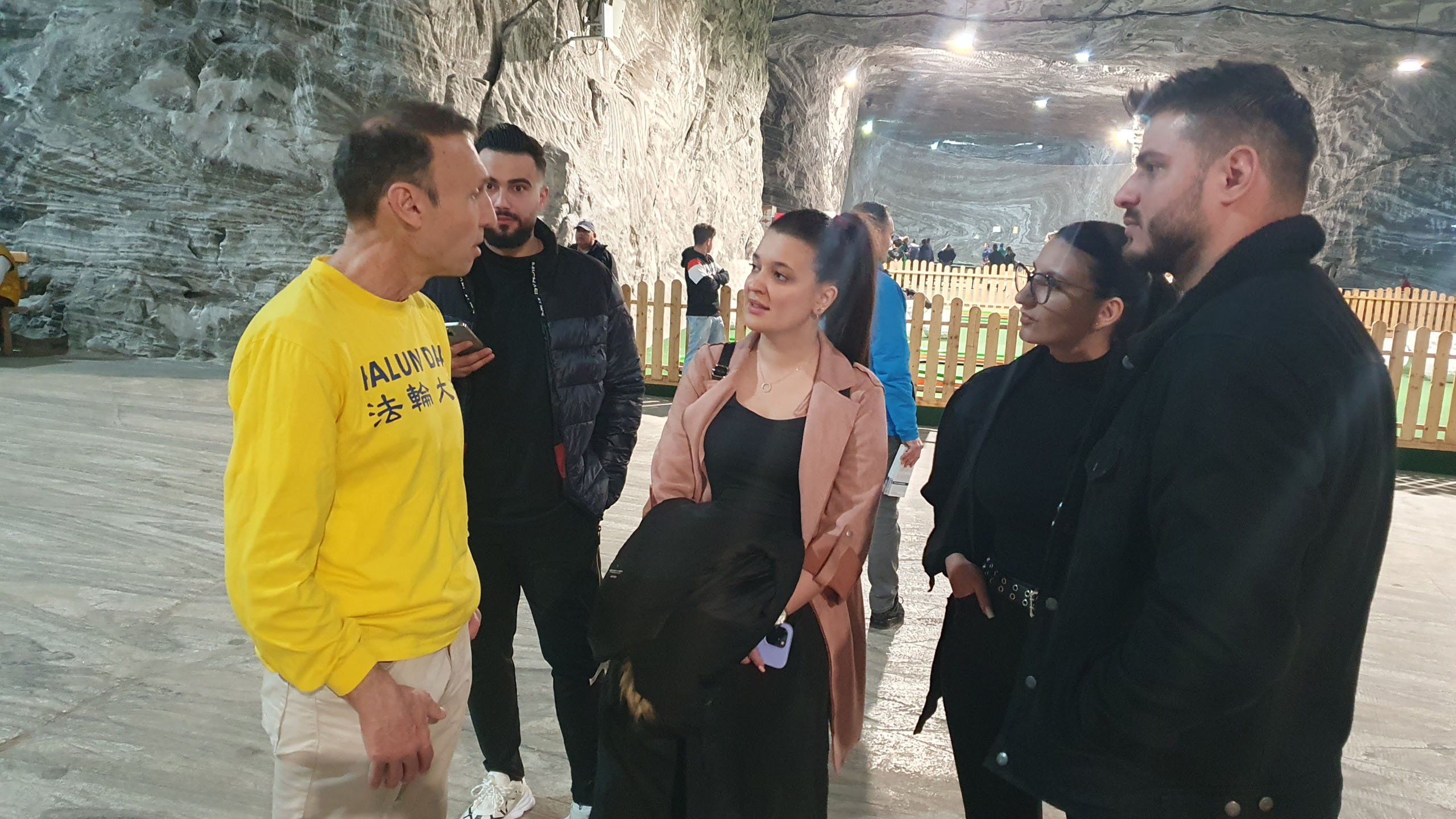 四名来自布加勒斯特(Bucharest)和皮特什蒂(Pitești)的学生被法轮功学员的炼功场面所吸引,他们驻足观看,随后又与学员交谈。