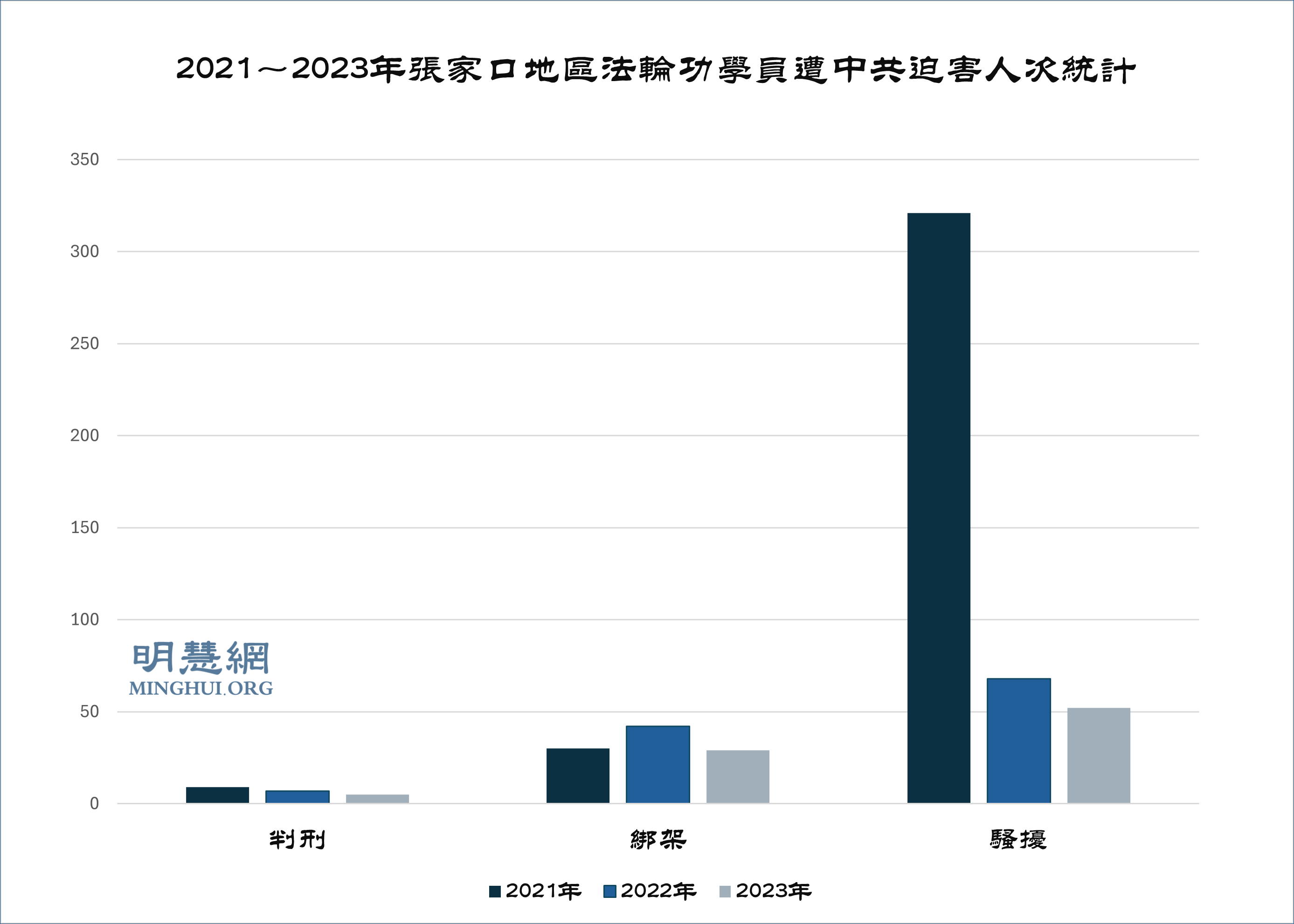 ![]() 图1:2021~2023年张家口地区法轮功学员遭中共迫害人次统计 |