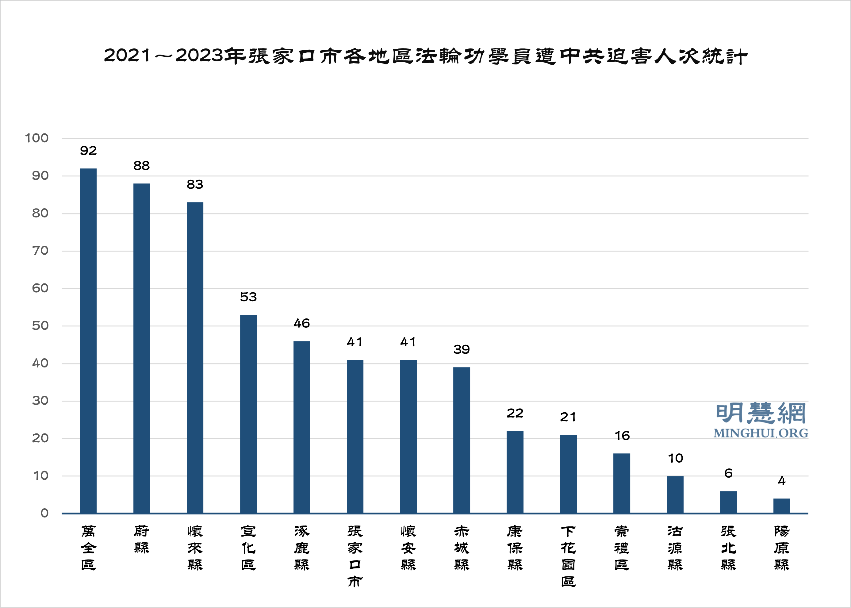 ![]() 图2:2021~2023年张家口市各地区法轮功学员遭中共迫害人次统计 |
