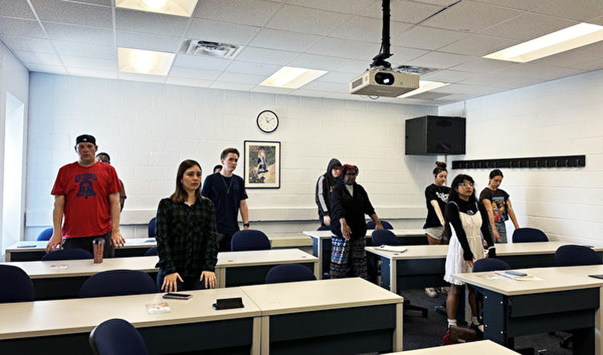 ![]() 图2~3:二零二四年四月十五日,法轮功学员应邀参加拉萨尔大学举办的全球语言和文化意识周活动。学生们正在学炼法轮功。 |