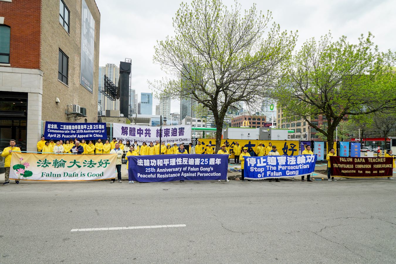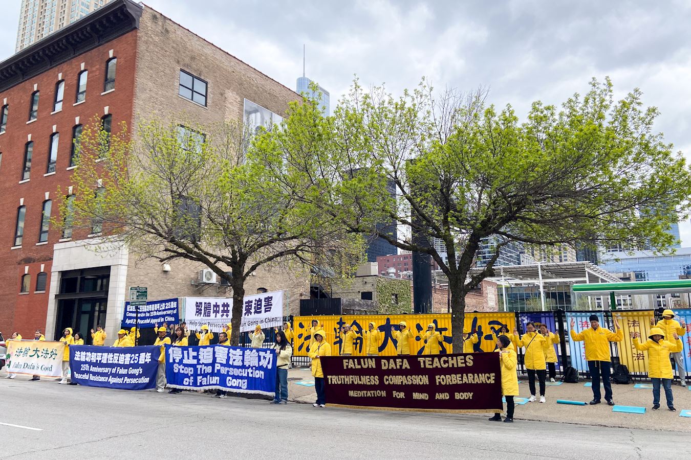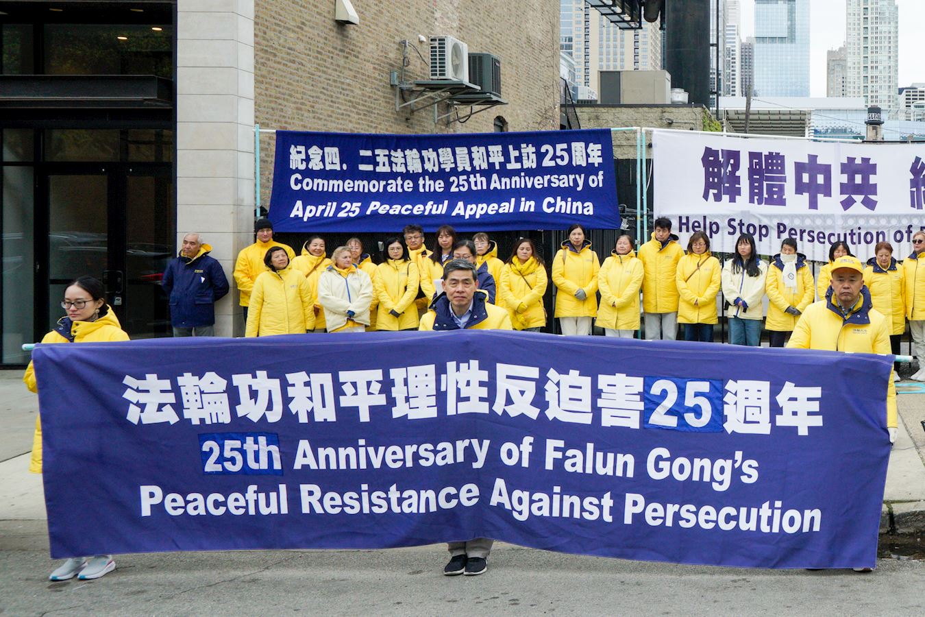 ![]() 图5:法轮功学员林先生(前排中手持横幅)在芝加哥中领馆前参加集会,纪念法轮功学员“四·二五”和平上访二十五周年。 |
