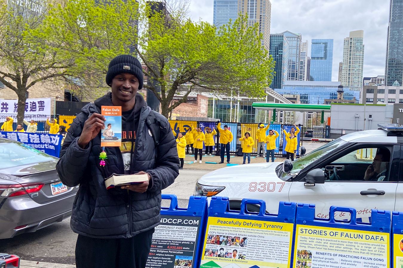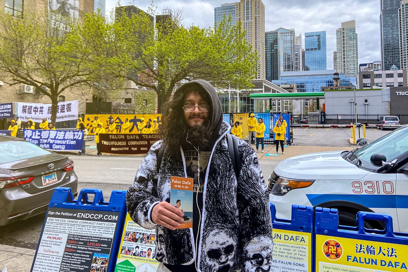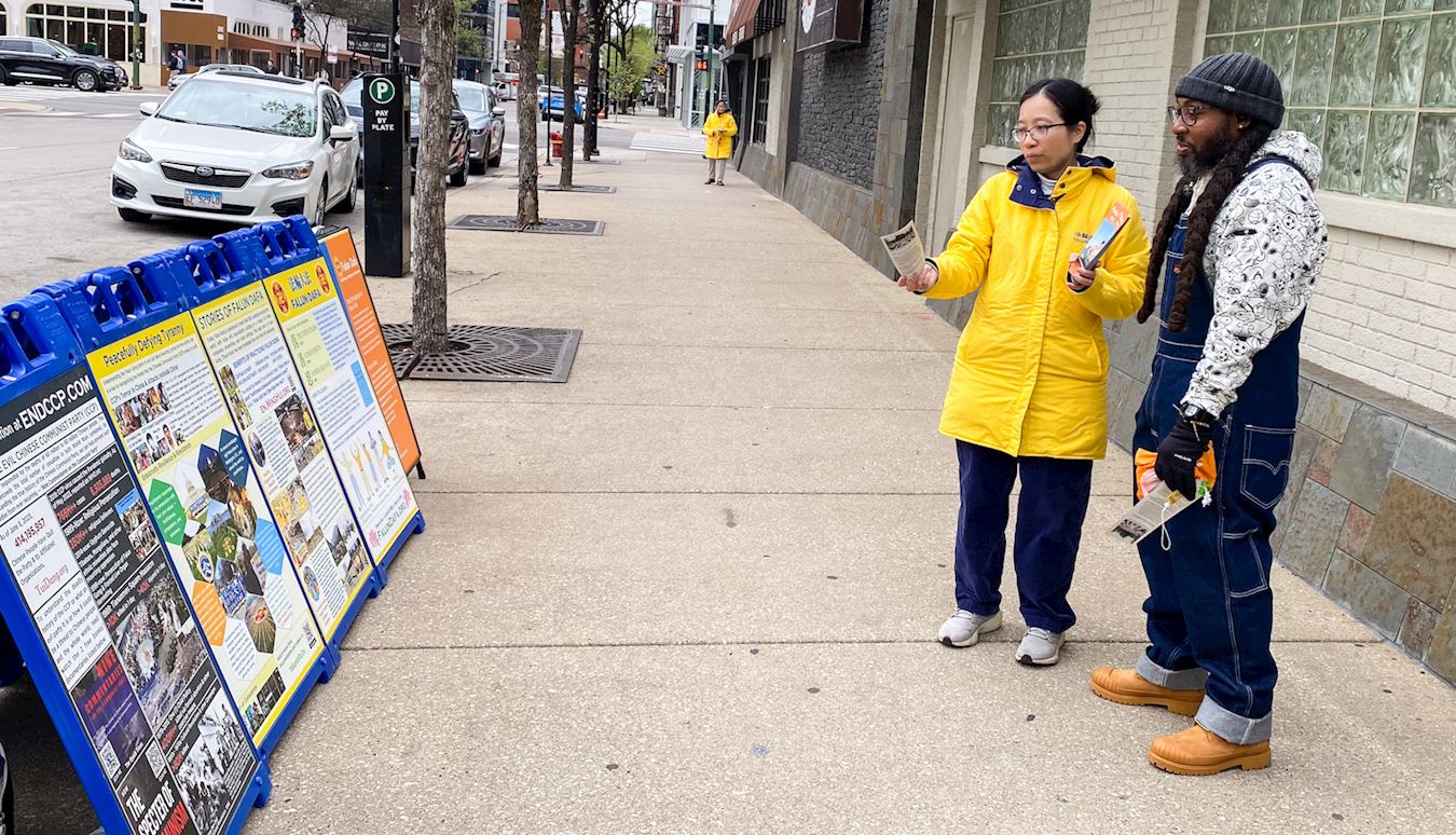 芝加哥居民布尼斯特·鲍蒂斯塔(Blamenest Bautista)被法轮功学员和平的抗议方式所吸引。他说:“我从未见过如此平和的抗议活动,这是一个很好的方式来表达自己。”
