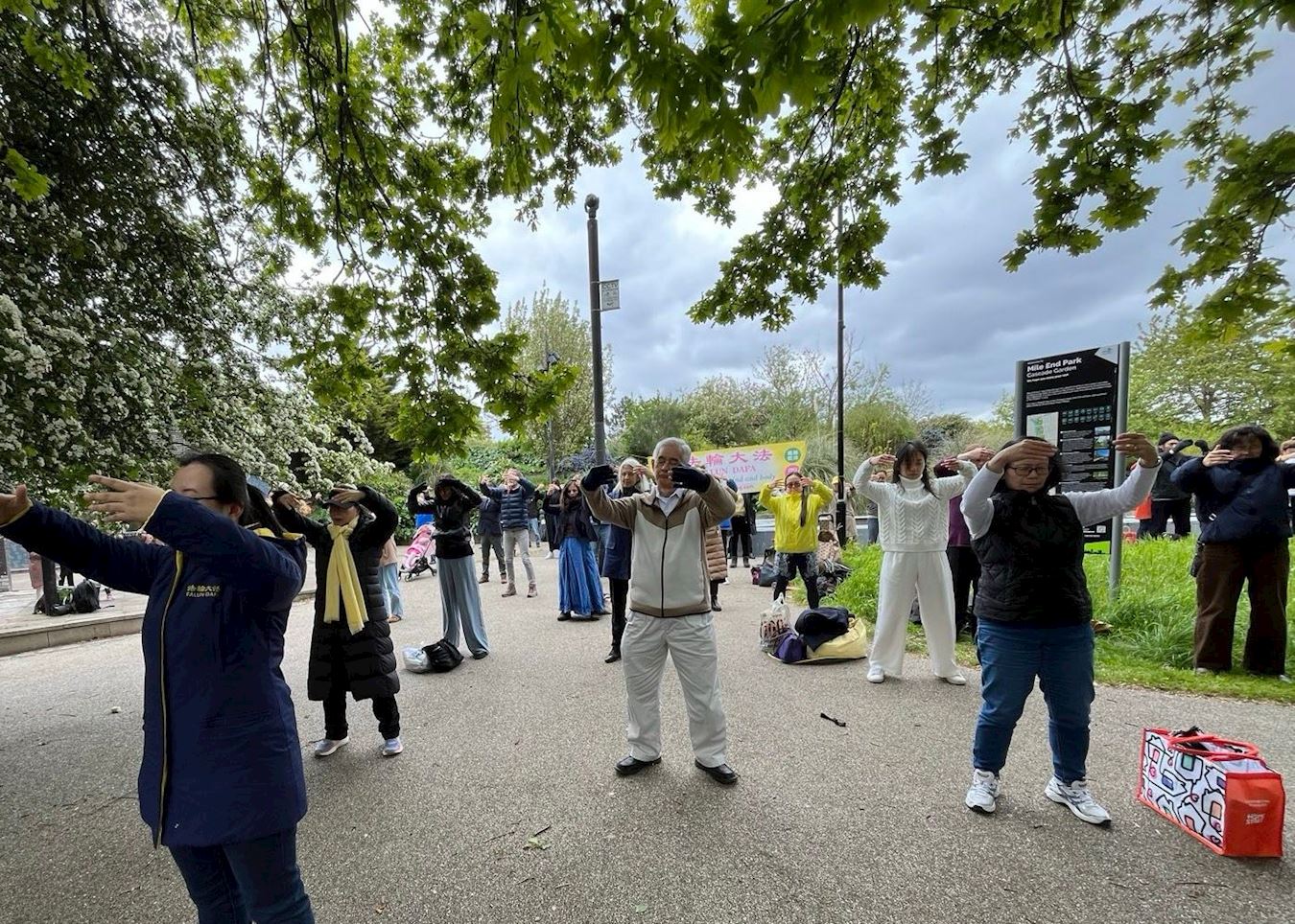 ![]() 图1~2:法轮功学员在东伦敦公园里集体炼功 |